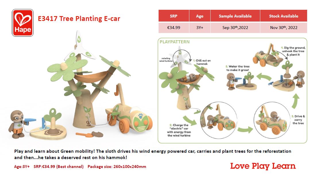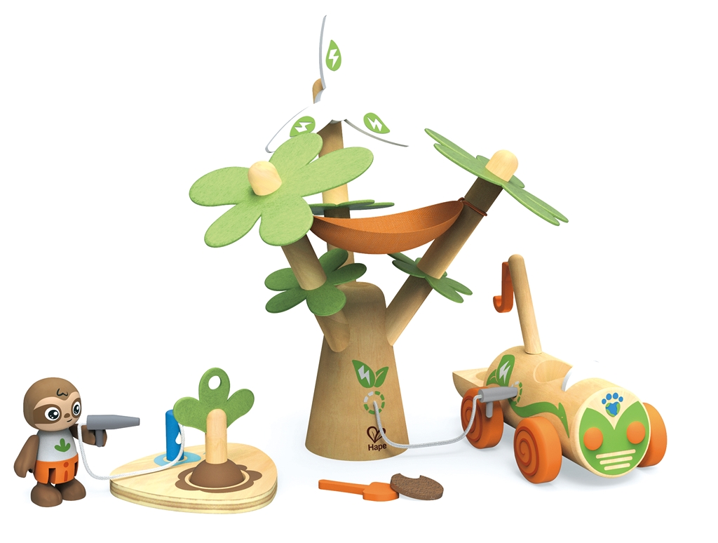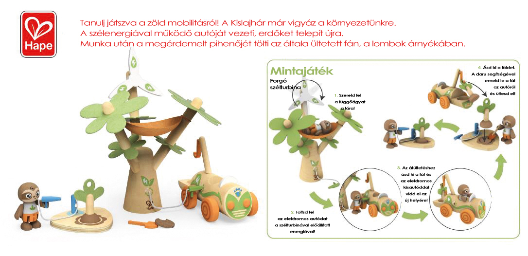 A játék során fejlődik a gyerekek finommotorikája, szem-kéz koordinációja, fantáziája, pozitív hozzáállása a természethez. A készletben találunk egy magas fát, amelyen egy szélkerék és egy függőágy is található. Az elektromos autót ez a szélturbina tölti fel újra, valamint az autó segítségével fákat is lehet ültetni. Az autónak egy daruja és egy kampója is van. Az autó sofőrje egy kedves kis lajhár, aki ha kell gödröt ás, fát ültet és meg is locsolja azt. A munka után pedig a függőágyban töltheti jól megérdemelt pihenését.