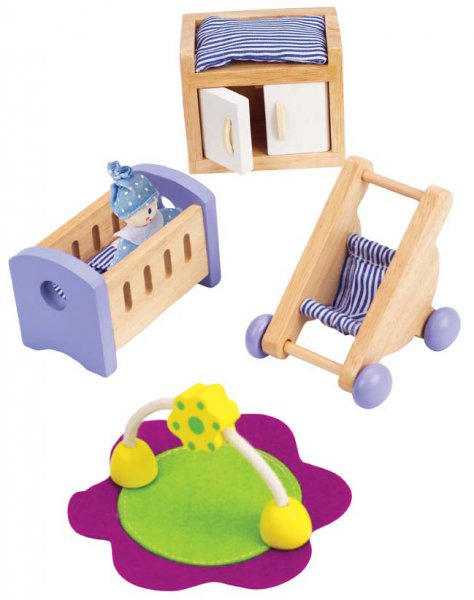 Hape Bébiszobabútor - Babaházhoz A Hape babaházak egyik nagyszerű kiegészítője ez a bébiszoba bútor összeállítás. A 8 darabos készletben megtalálható: 1 db babaágy, 1 db kétajtós pelenkázó szekrény, 1 db babakocsi, 1 db játék baba, 1 db játszószőnyeg, 1 db játék a játszószőnyeghez 1 db paplan, 1 db párna. Ajánlott korosztály: 3 – 10 Év