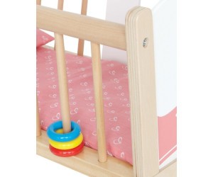 Hape Bölcső - Játékbabához A termék mérete: 48x33,5x25,5 cm - A doboz mérete: 47x13,5cmx36,5 cm - Súly: 1 kg. - Kiváló eszköz a babázós szerepjátékokhoz. - Finoman billegtethető. - Két vége fehér és rózsaszín mintás, oldalai ácsos kialakításúak. - A készlet tartalmazza az ágyneműt is! - A bölcső egyik rúdján 3 db színes mozgatható gyűrű.