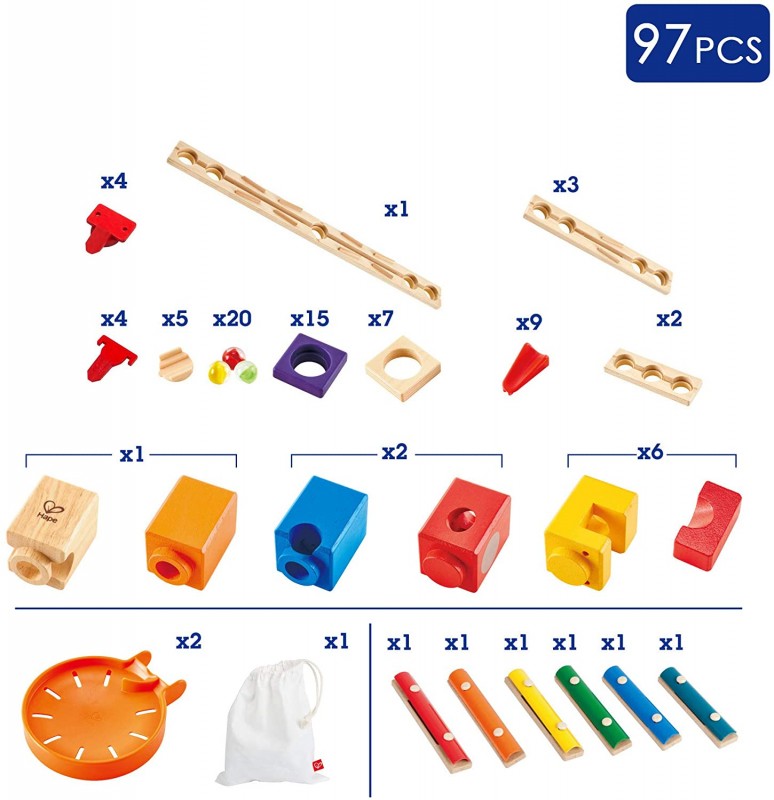 Hape Zenélő golyópálya - Quadrilla A doboz mérete: 52x36x8 cm Tartalma: 77 db pályaelem, 20 db üveggolyó, 1 db textilzsák. Többféleképpen megépíthető fantasztikus minőségű golyópálya, natúr- és festett fa, valamint műanyag és fém elemekből. A golyók útjába több, különböző színű, hangot adó, xilofon lapocska-szerű pályaelemet lehet építeni, emiatt zenél a golyópálya, melynek színes és natúr fa elemei, érdekes műanyag alkatrészei teszik próbára a fantáziát. A 20 db üveggolyót egy praktikus textilzsákban tárolhatjuk, amikor épp nincsenek használatban. A Hape Quadrilla applikáció ingyenesen letölthető az Apple Store és a Google Pay áruházakból. Összerakási ötletként és segítségként használhatjuk. Ajánlott korosztály: 4 – 99 Év