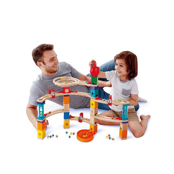 Hape Kastély golyópálya - Quadrilla A doboz mérete: 52x36x8 cm Tartalma: 52 db pályaelem, 50 db üveggolyó, 1 db textilzsák. Többféleképpen megépíthető fantasztikus minőségű golyópálya, natúr- és festett fa, valamint műanyag és fém elemekből. Spirál, csengők, színes és natúr fa elemek, érdekes műanyag alkatrészek teszik próbára a fantáziát. A kastély tetején a golyókat a toronyban lévő zászló tekerésével tudjuk elindítani. Az 50 db üveggolyót egy praktikus textilzsákban tárolhatjuk, amikor épp nincsenek használatban. A Hape Quadrilla applikáció ingyenesen letölthető az Apple Store és a Google Pay áruházakból. Összerakási ötletként és segítségként használhatjuk. Ajánlott korosztály: 4 – 99 Év