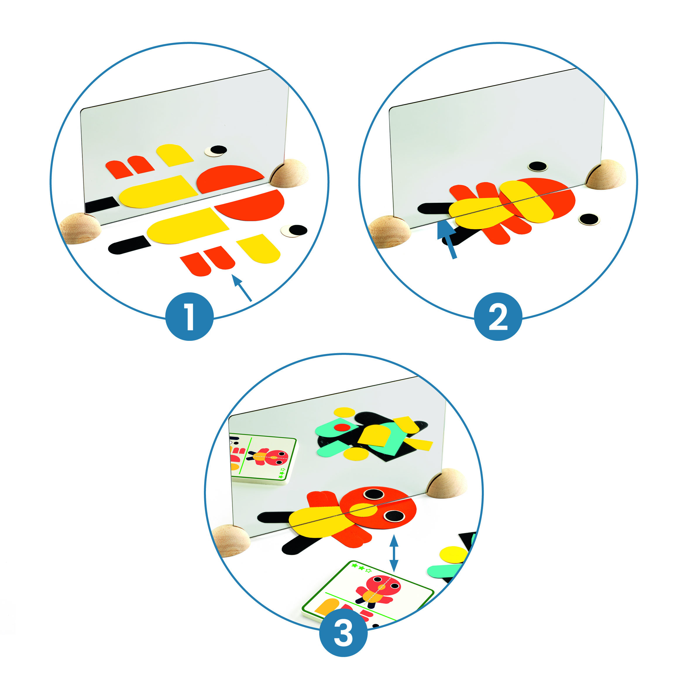 Különleges fejlesztő játék, amely a tükörhasználatra és a vizuális észlelésre épít. A játék célja, hogy a gyermekek felfedezzék a tükör segítségével a képek tükrözött változatait. A gyermekek a tükör alá helyezve a kártyákat, forgatják őket, amíg meg nem találják a képen látható mintához illő tükrözött képet. A játék fejleszti a vizuális figyelmet, a térbeli tájékozódást és a finommotorikus készségeket.