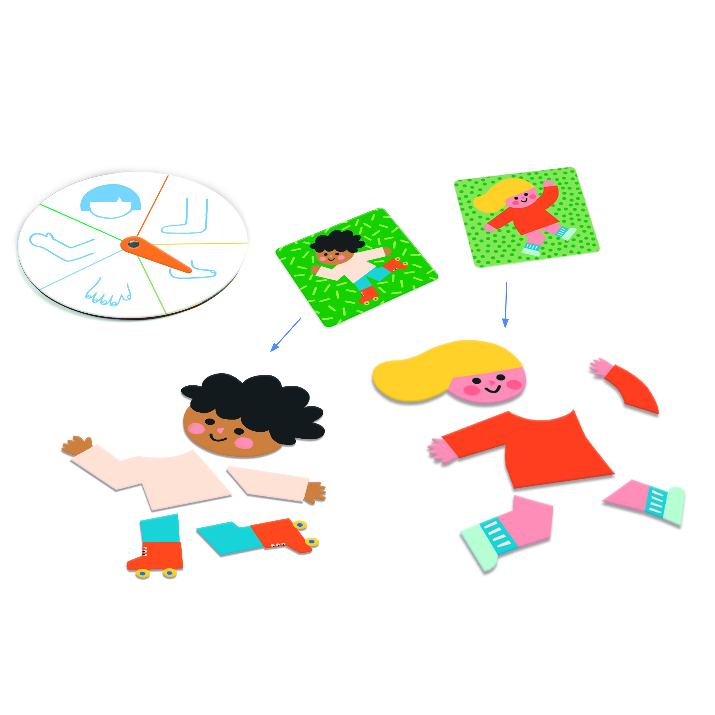 Ideális első társasjáték a legkisebbek számára, amely játékos formában vezeti be őket a testfelépítés és a testrészek világába. A gyerekek feladata, hogy saját kis figurájukat darabonként – fejtől a lábujjakig – összeállítsák. Minden körben pörgetnek egyet, és ha például kezet, lábat vagy fejet kapnak, meg kell nevezniük, majd a megfelelő helyre illeszteniük azt.