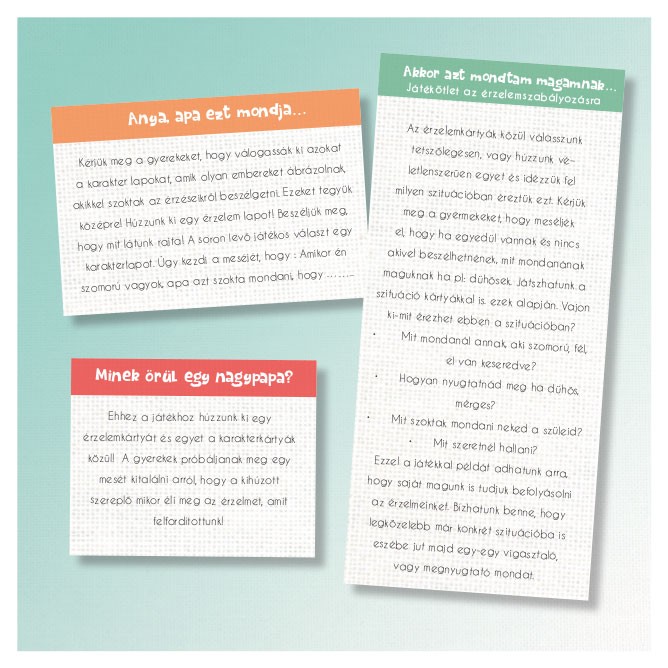 – Minek örülne egy nagypapa? Adjunk a gyermek kezébe egy karaktert és egy érzelmet, majd kérjük meg, hogy meséljen nekünk kicsit arról, hogy szerinte az adott személy mikor élheti át a képen látott érzelmet, ezzel segítve neki, hogy mások érzéseiben is gondolkodjon, ne csak a saját kis világában éljen.