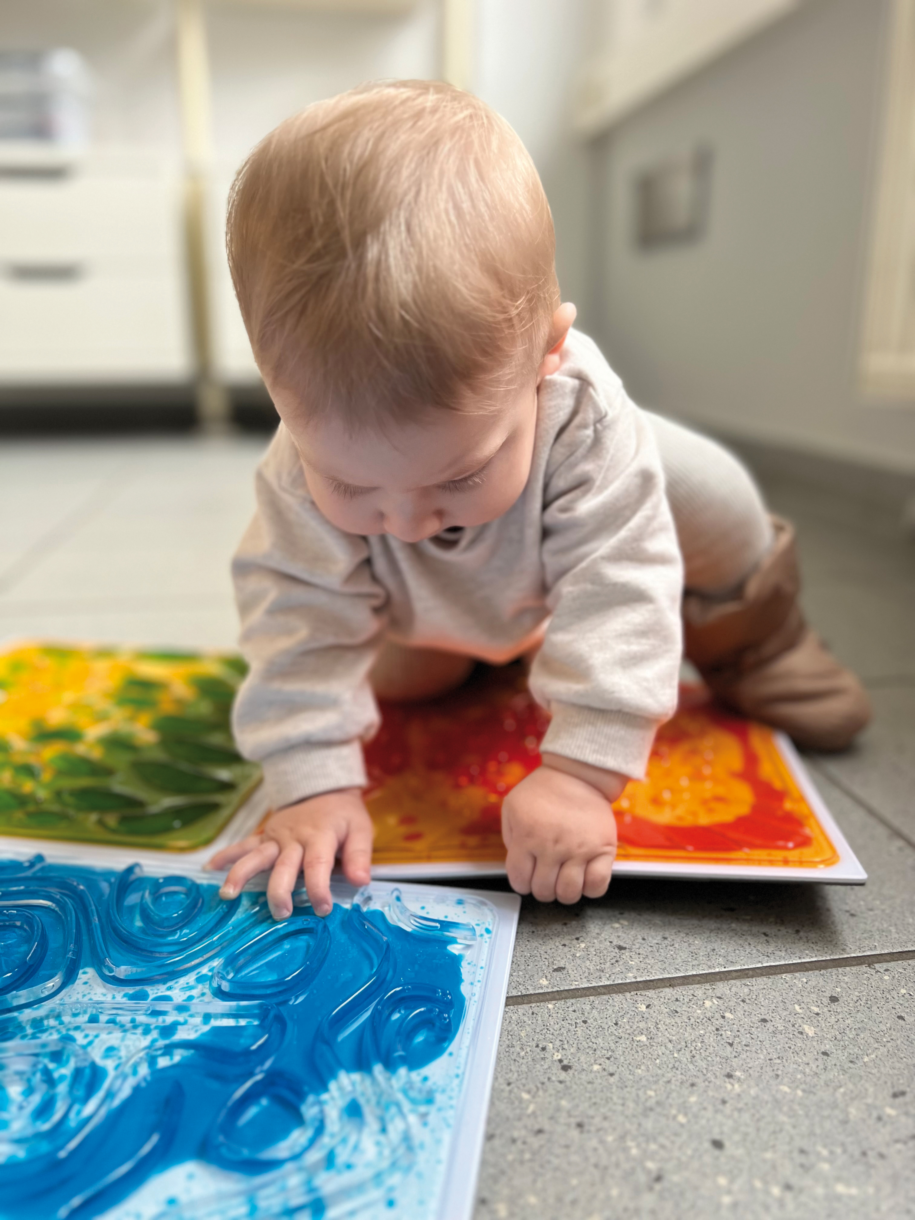 A 4 részes szett egy izgalmas és szórakoztató érzékszervi fejlesztő játék gyermekek számára. A szett négy különböző, folyadékkal töltött felülettel rendelkezik, amelyek különféle textúrákat és mintákat kínálnak. A színes folyadékok mozgása és az eltérő struktúrák segítenek a gyermekeknek a tapintás, egyensúly és koordináció fejlesztésében, miközben serkentik a vizuális és taktikus érzékelést.
