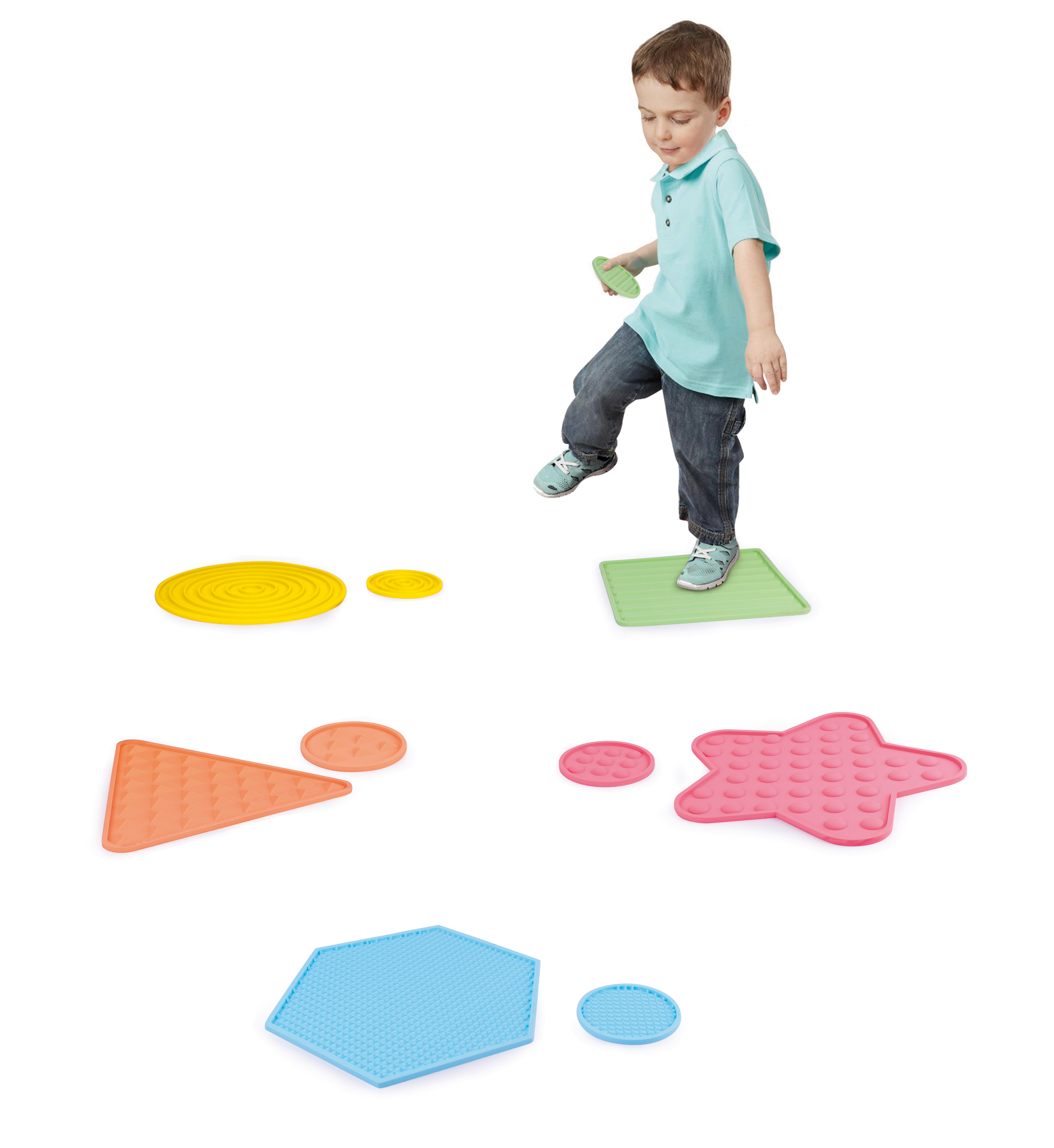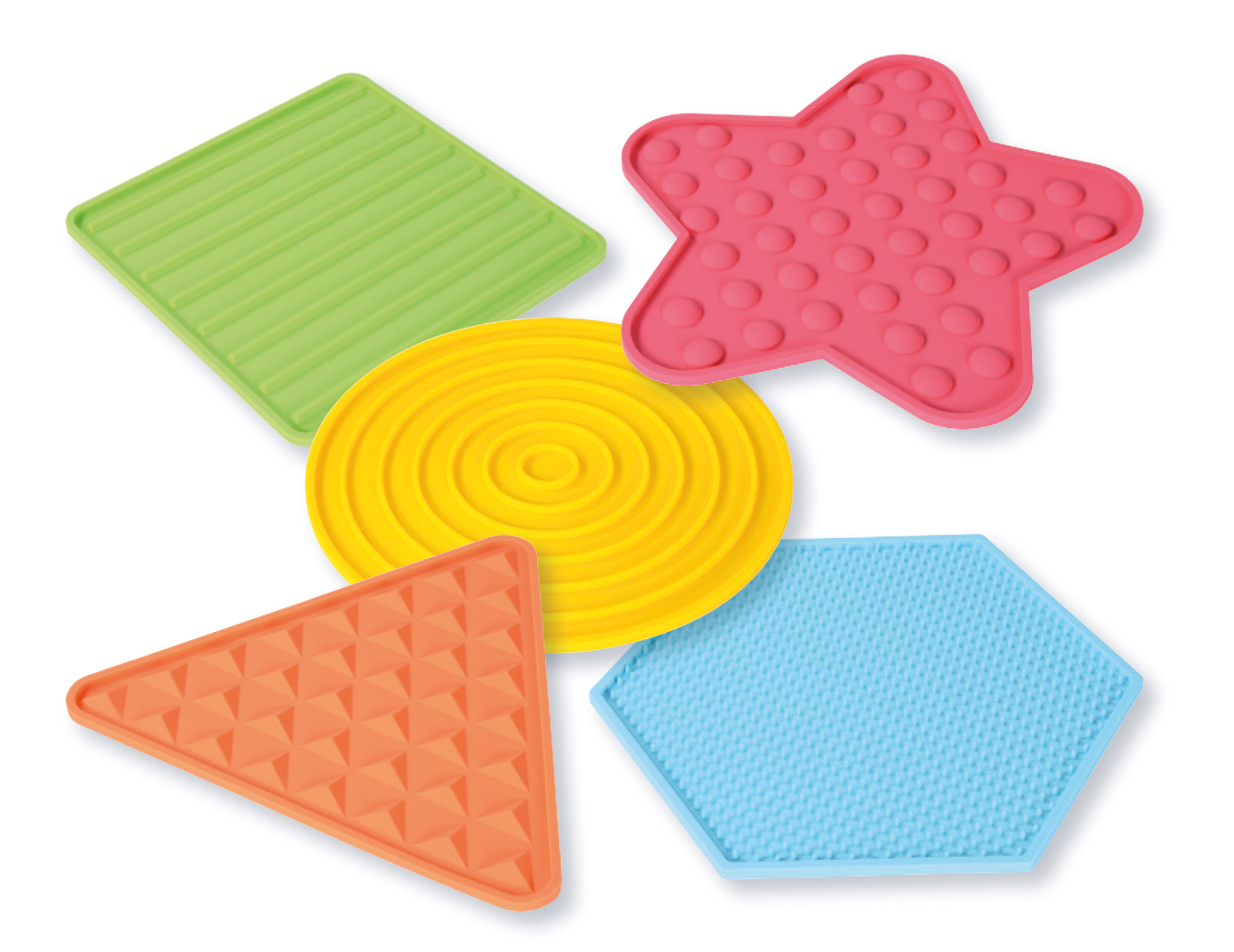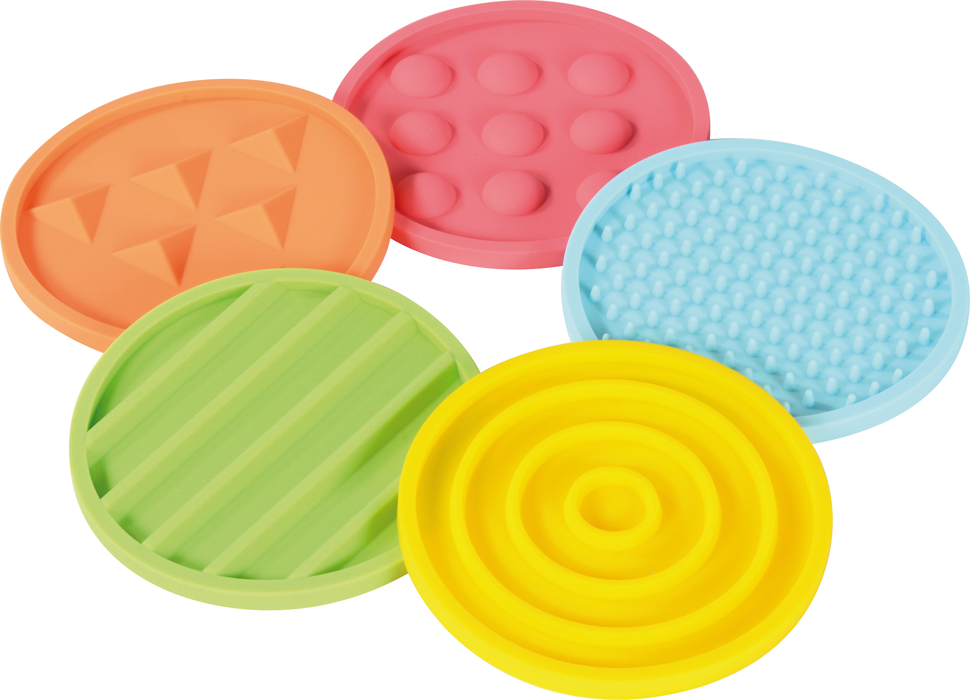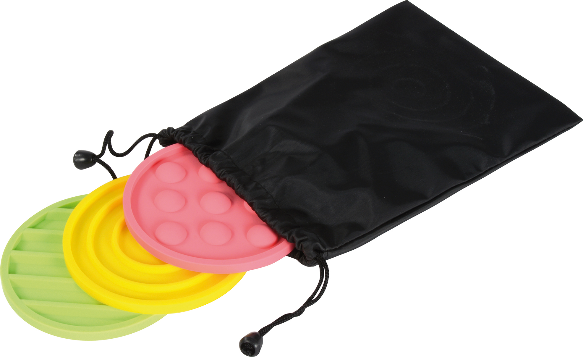 Termék mérete: - kis kör elemek: 10 cm átmérő - nagyméretű elemek: 24x24x0,6 cm A készlet összesen 5 db kisméretű és 5 db nagyméretű elemet tartalmaz. A könnyed tárolás érdekében a készlethez egy tárolózsák is tartozik. Minden elem rugalmas, de mégis strapabíró szilikonból készült. Intézményi és otthoni használatra egyaránt alkalmas.