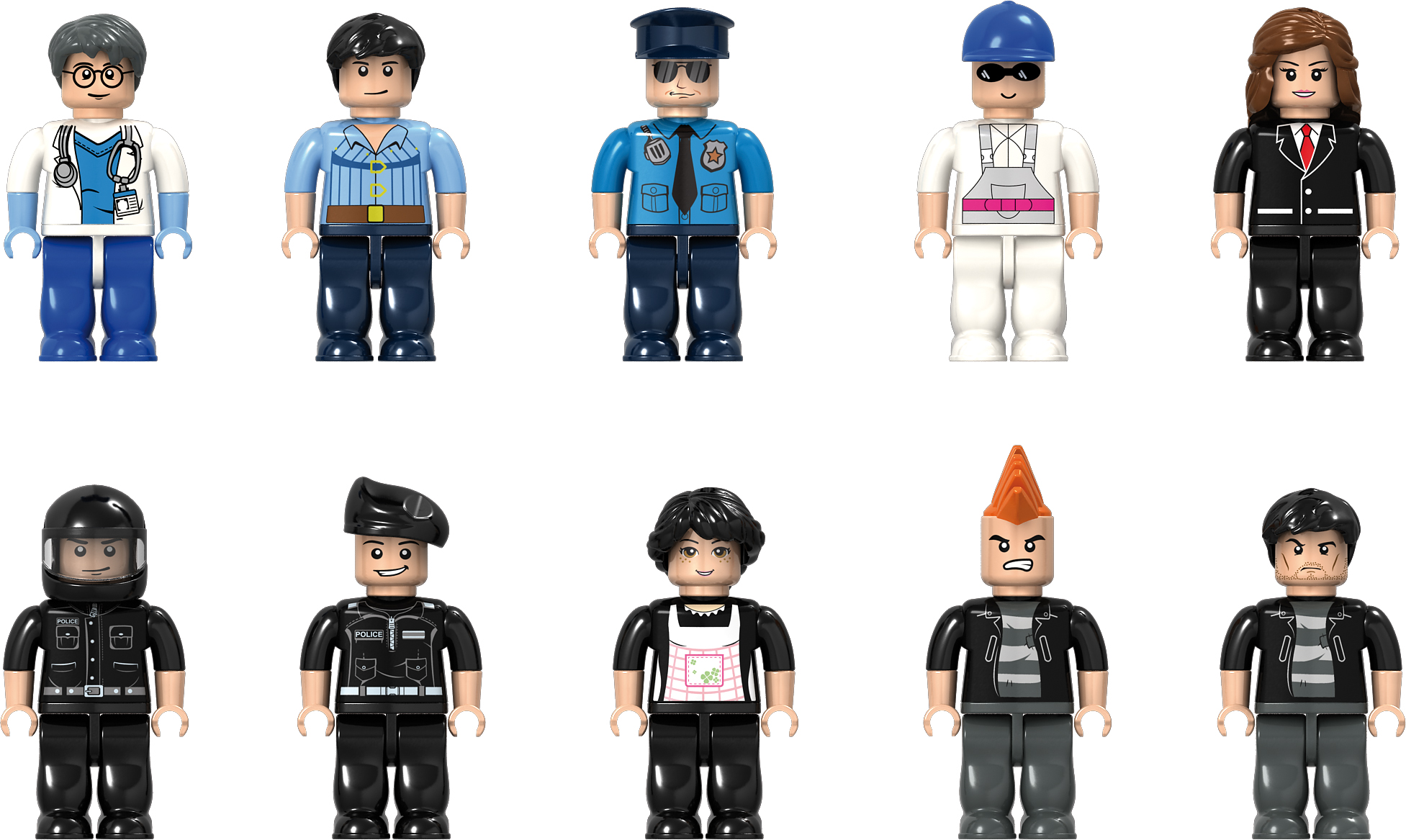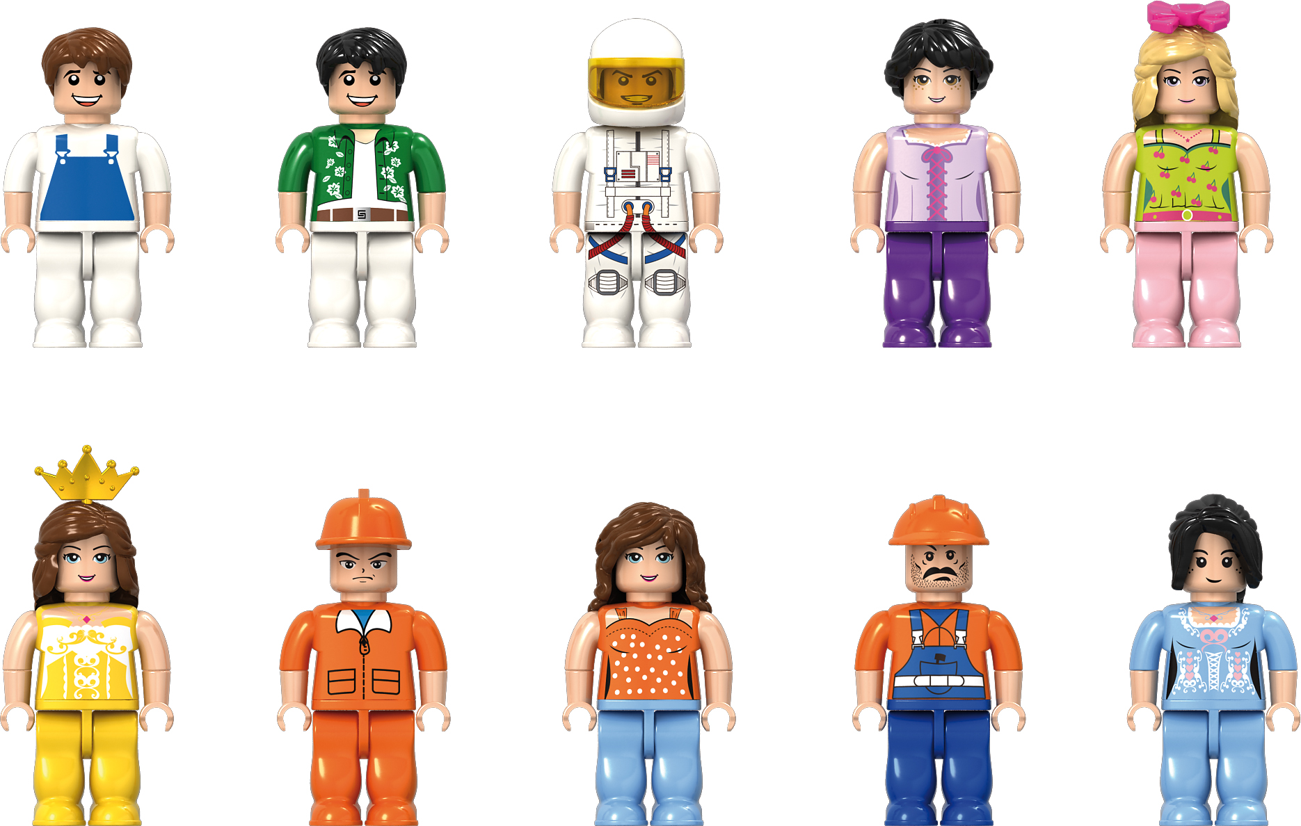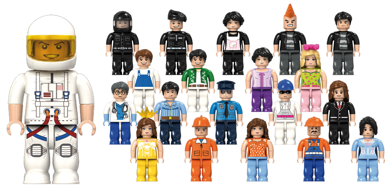 A szett tökéletes választás, ha izgalmas szerepjátékokat szeretnél létrehozni! A szett 20 különböző karaktert tartalmaz, mint például asztronauta, építőmunkás, versenyző, orvos, hercegnő, kertész és még sok más. Ezek a változatos figurák serkentik a gyerekek fantáziáját, lehetőséget adva nekik arra, hogy saját kreatív történeteket alkossanak és különböző szerepeket játsszanak el.