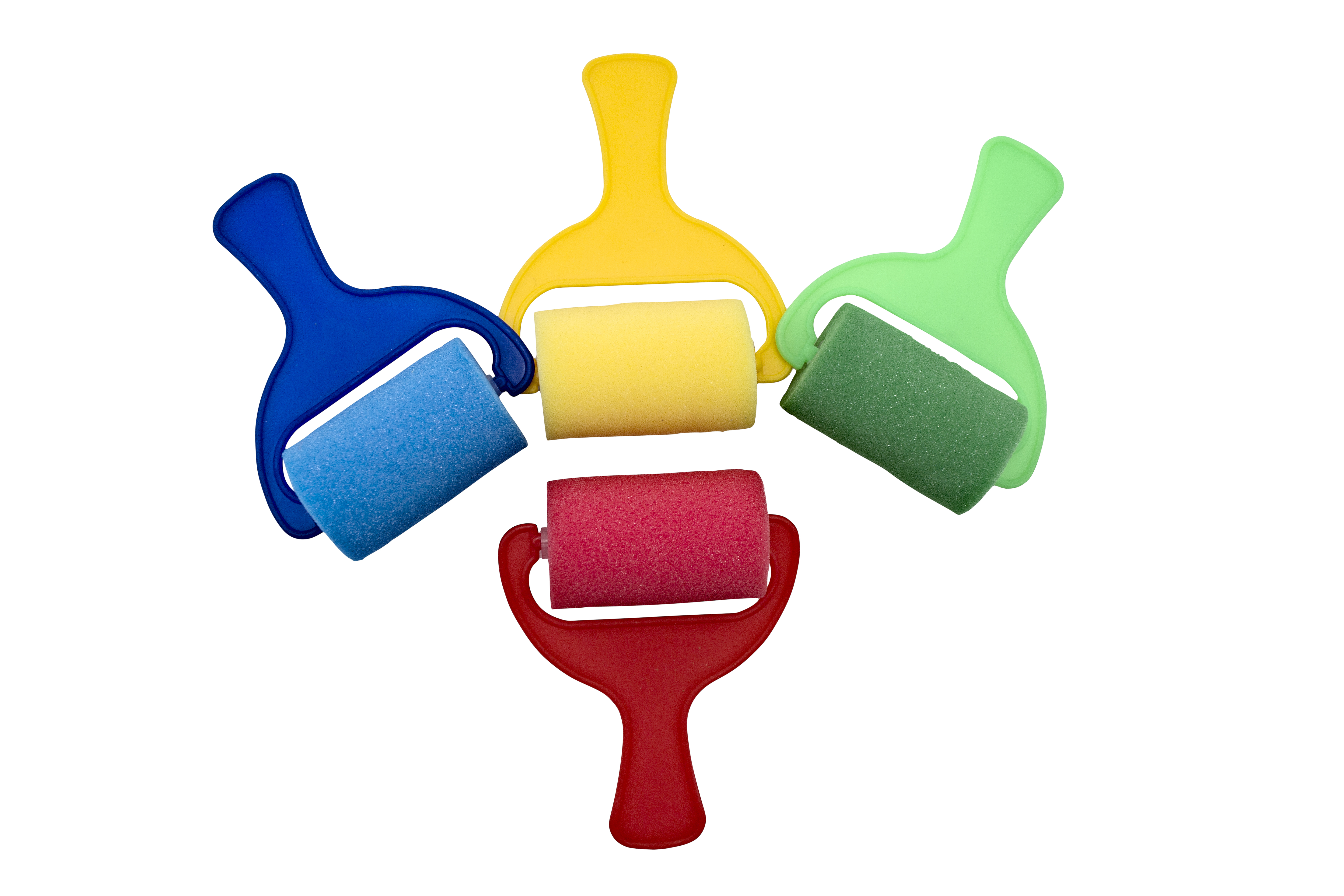 4 db görgős szivacshenger különböző színekben: piros, kék, zöld, sárga. Ezeket a műanyag fogantyús hengereket kifejezetten a kis kezek számára tervezték, és ideálisak a használatra kész festékkel, vagy festékpárnákkal való használatra.