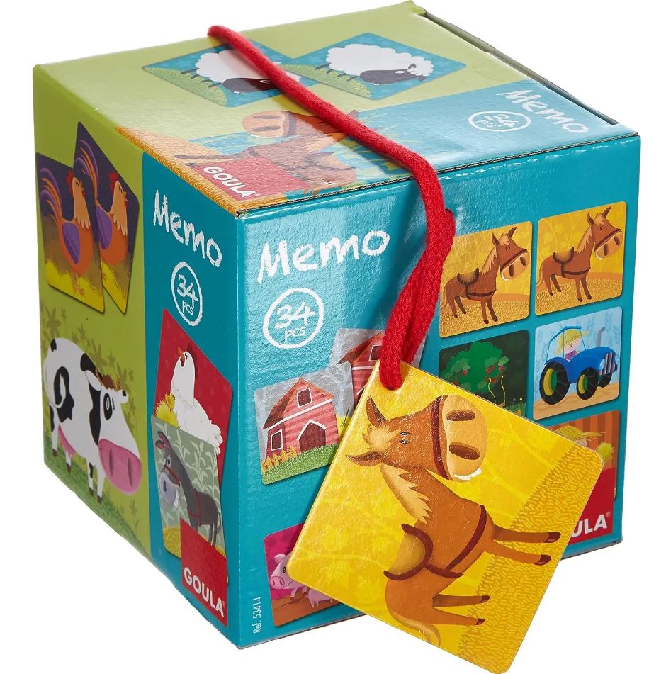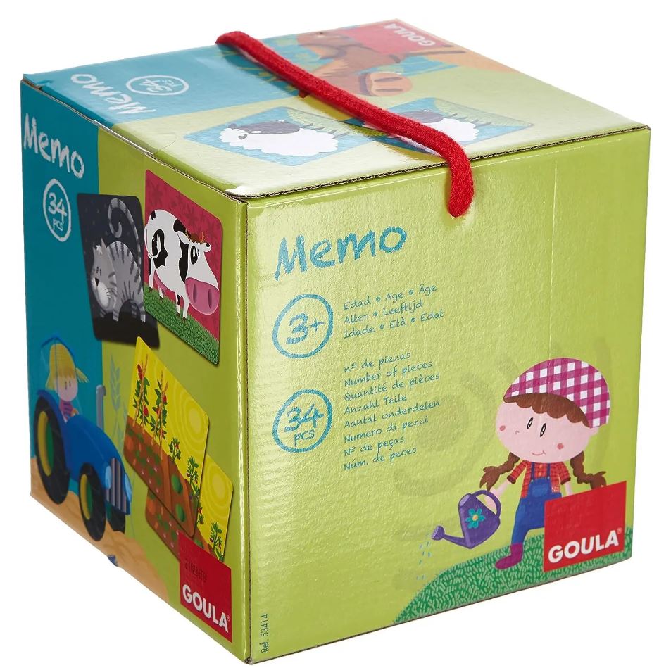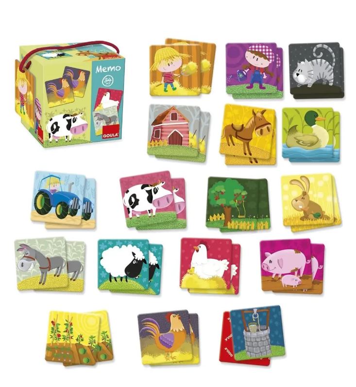 Farm memória, GOULA Doboz mérete: 16x16x16 cm A készlet összesen 34 db memória lapkából áll. A szett farm tematikával lett kialakítva, így a kis lapocskákon házi- és haszonállatok, mezőgazdasági járművek és eszközök, illetve jellegzetes tanyasi épületek láthatók. A lapok egy strapabíró kartondobozban érkeznek, melyen egy kis fülecske is található, így a gyerekek akár kirándulásokra is magukkal vihetik kedvenc memória játékukat. A játék 3 Éves kortól ajánlott. Játékidő: 20 perc Ajánlott korosztály: 3 Év