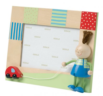 Fából és textilből készült, kedves mintájú fényképkeret, amelyet egy kisfiú figura és egy piros autó díszít. A természetes fa színei és a játékos részletek barátságos hangulatot teremtenek, így ideális választás gyerekszobába vagy ajándéknak. A keretbe egy kedvenc fotó helyezhető, amelyet a figura még vidámabbá tesz.