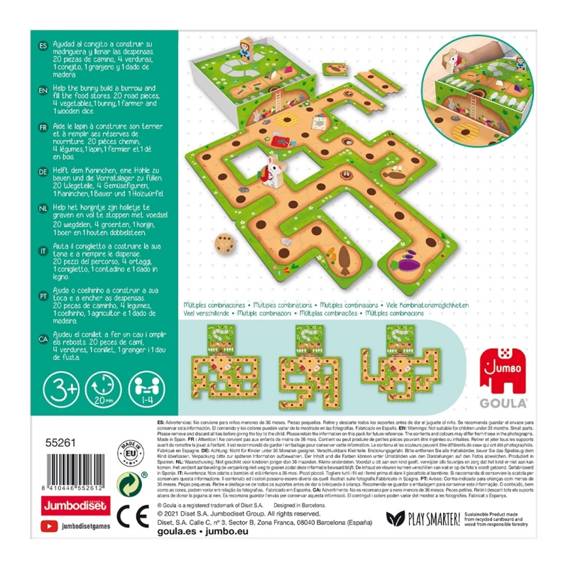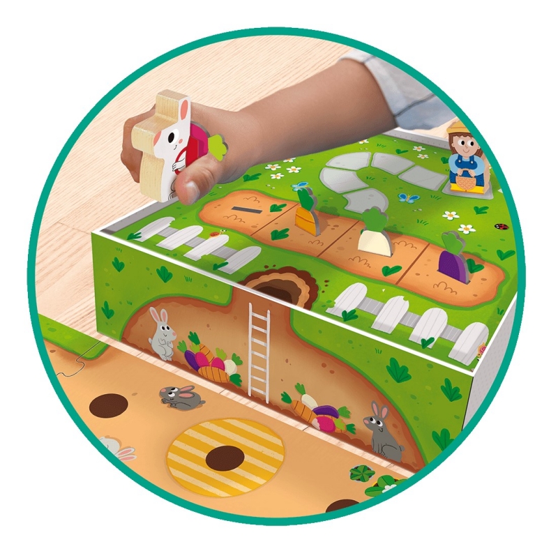 A játék előkészülete: Építsétek meg a kacskaringós alagutat, ami elvezet az odúhoz és a többi játékoshoz. Ha elkészült, helyezzétek el a répákat az ösvények végén. A játék menete: A játék célja, a zöldségek elszállítása az odúba. Tedd a nyuszi hátizsákjába a répát. Az első játékos a kezdő mezőre teszi a nyuszit, majd dob a dobókockával és lép. Ha odaértél az odúba a zöldséggel, vidd vissza a nyuszit a kezdő pontra, hogy még több zöldséget felvehessen. Ha mind a négy odú megtelt, a játék véget ért, a játékosok nyertek. Vigyázz! A farmer is dob a kockával, mindig egyet léphet előre. Ha előbb éri el a veteményest, mint mielőtt megtelik az odú, észreveszi az alagutat és a nyuszinak menekülni kell! Ilyenkor a játékosok elvesztik a játékot, de újra próbálkozhatnak. Titkos alagút mező: Ha titkos mezőre lépsz, eldöntheted, hogy bemész-e az alagútba és odaviszed a nyuszit a másik alagút mezőjéhez vagy folytatod az eredeti ösvényen.