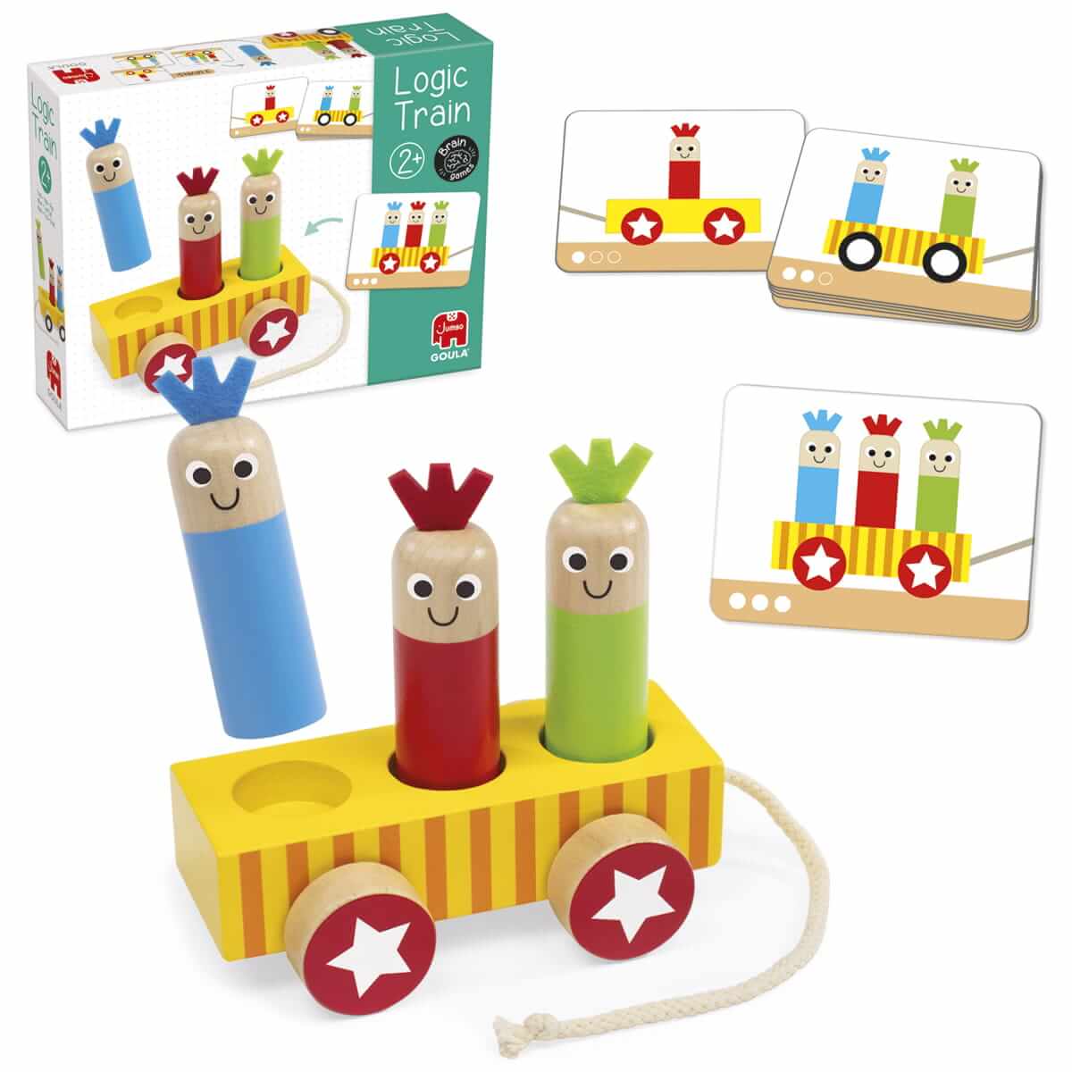 A Goula vonatos játéka 2 Éves kortól nyújt izgalmas játéktevékenységet a gyerekeknek. A különböző nehézségű feladatkártyákon szereplő minta alapján kell a kicsiknek összeállítani a vonatot. Figyelniük kell arra, hogy milyen kereket választanak és milyen sorrendben helyezik el a figurákat. Játék során fejlődik a finommotorikájuk, szem-kéz koordinációjuk, logikus gondolkodásuk. Megismerik a színeket, gyakorolják a sorba rendezést. A kártyák 3 nehézségi szinten tartalmazzák a feladatokat, attól függően, hogy 1, 2, vagy 3 figurát kell a vonatba helyezni. A játék minőségi fából készült, ezért hosszú ideig a gyerekek kedvenc játéka lehet.