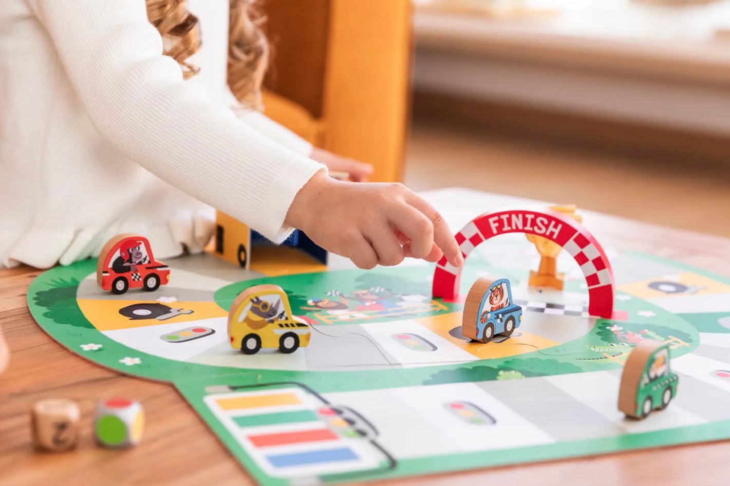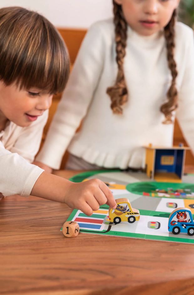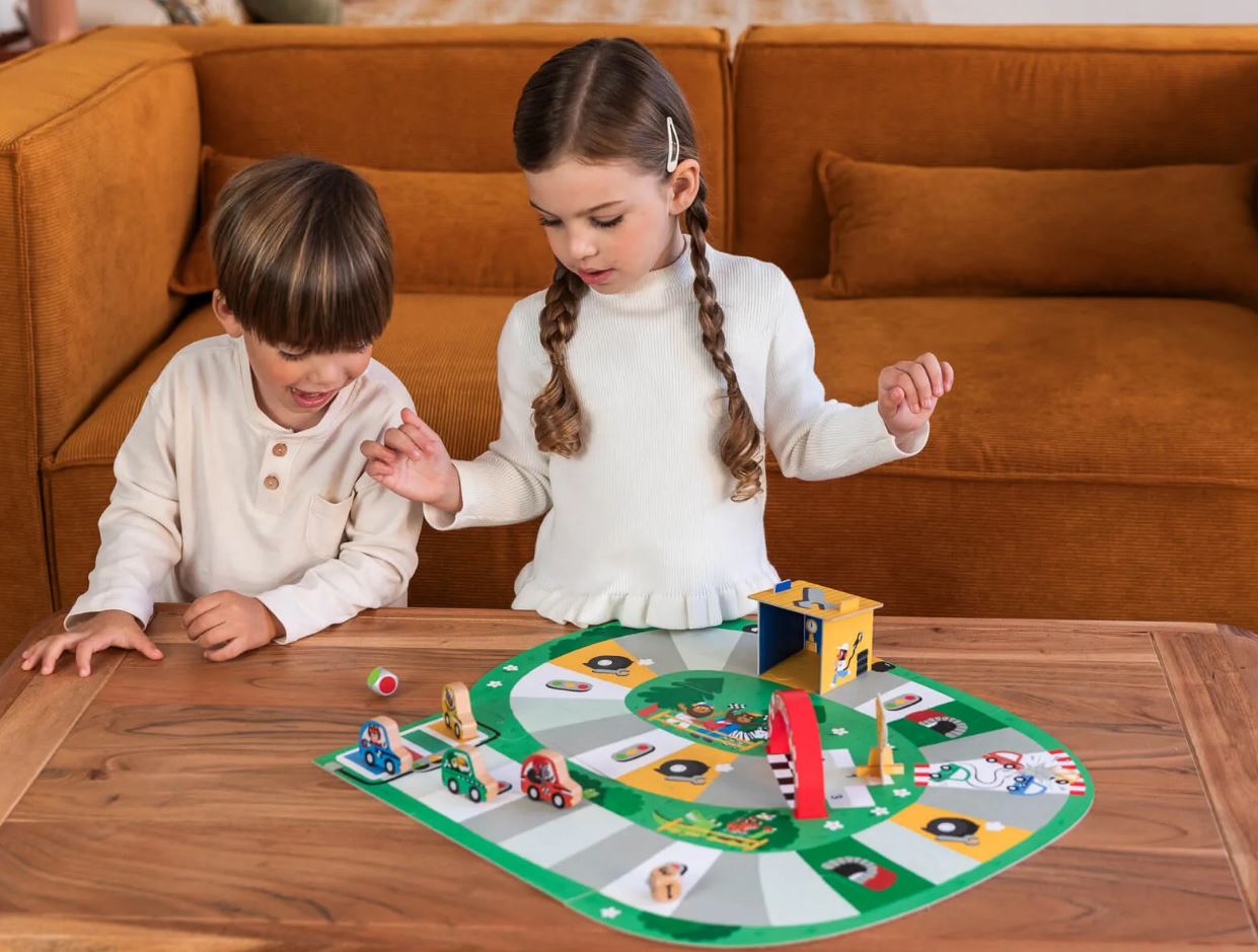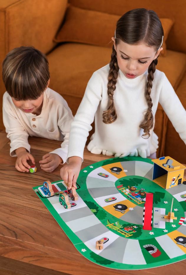 A Goula autóversenyzős társasjátéka a gyerekek nagy kedvence lesz, hiszen a színes pályán, kedves kis autókkal versenyezhetnek egymással.