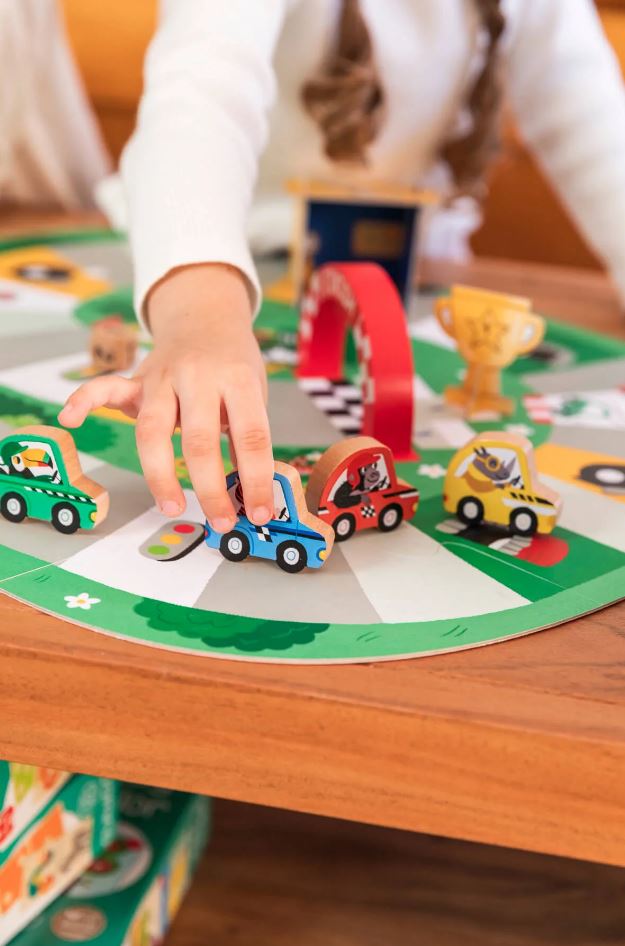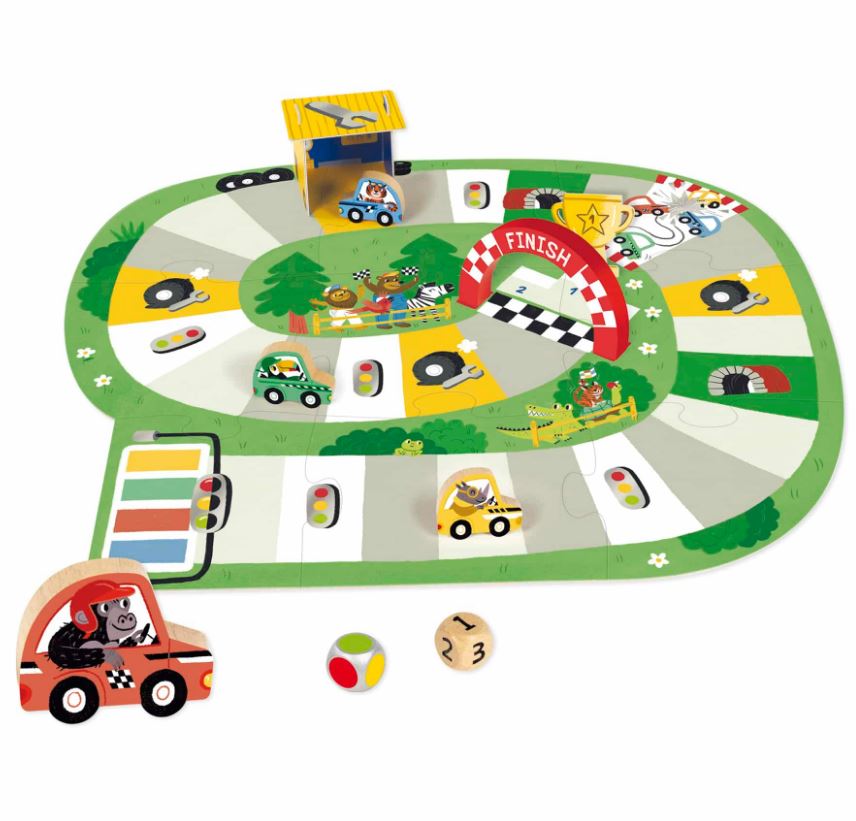 Első autóversenyem, GOULA Tartalma: - 9 db óriás puzzle elem - 2 db dobókocka - 4 db színes versenyautó - 1 db jelzőlámpa - javítóműhely - karton serleg - fa célkapu A játék során egy egy versenypályán kell küzdeni az első helyért. A 4 db színes versenyautót különböző állatkák vezetik, így igazán mókás hangulatot kelt a készlet. A célba érést a szám és színdobó kockák segítség Ével érhetjük el. A szett 3 Éves kortól ajánlott. Játékidő: 10 perc Ajánlott korosztály: 3 Év
