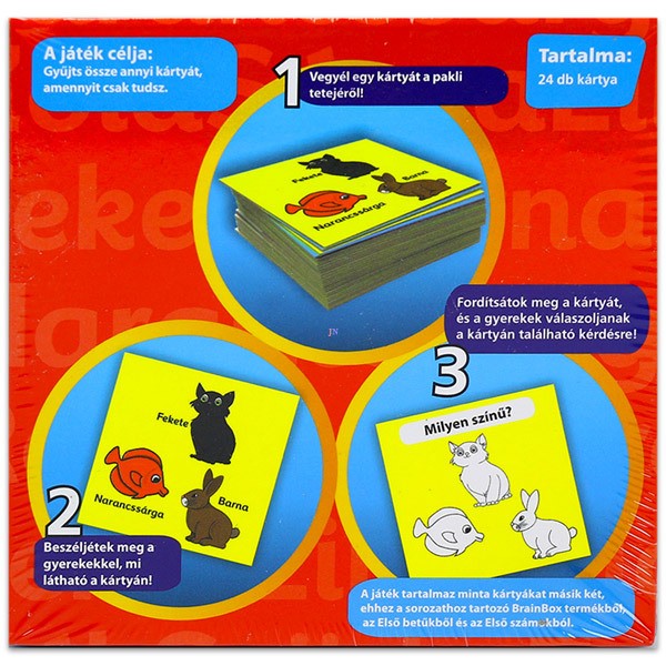 A BrainBox Első Színek segít az óvodásoknak játékosan elsajátítani a színeket. A gyerekek kártyákat húznak, egyik oldalukon állatok, növények és tárgyak vannak. Miközben beszélgetünk a kártyán lévő három képről, alaposan jegyezzünk meg mindent, mert amikor lefordítjuk a kártyát, emlékezni kell, mik voltak a képeken és azok milyen színűek voltak? Aki a kártya hátoldalán lévő kérdésre helyesen válaszol, megtarthatja azt. Ki tudja a legtöbb kártyát begyűjteni 5 vagy 10 perc alatt? Az lesz a győztes!