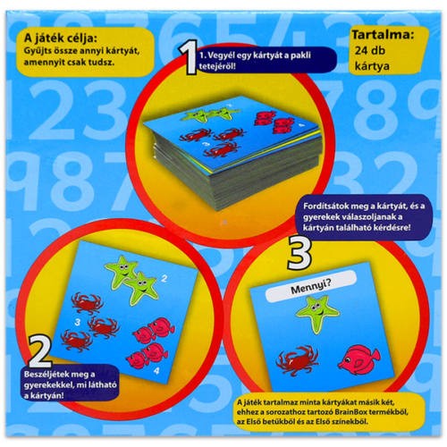 A BrainBox Első Számok segít az óvodásoknak játékosan elsajátítani a számokat. A gyerekek kártyákat húznak, egyik oldalukon állatok, növények és tárgyak vannak és mellettük egy-egy szám, hogy miből mennyi van az adott képen. Miközben beszélgetünk a képekről, alaposan jegyezzünk meg mindent, mert amikor lefordítjuk a kártyát, emlékezni kell, miből mennyi is volt a képen? Aki a kártya hátoldalán lévő kérdésre helyesen válaszol, megtarthatja azt. Ki tudja a legtöbb kártyát begyűjteni 5 vagy 10 perc alatt? Az lesz a győztes!