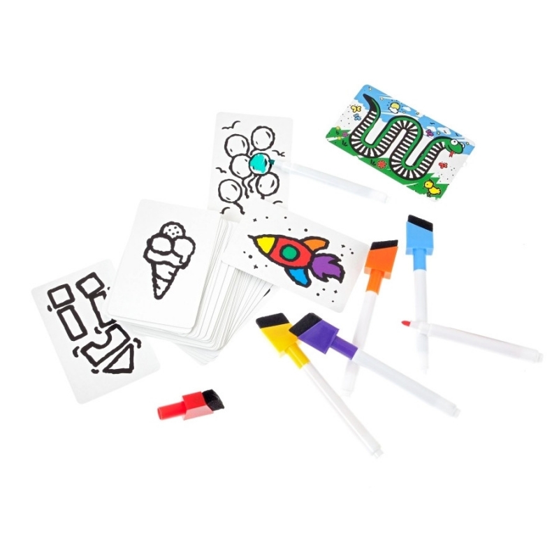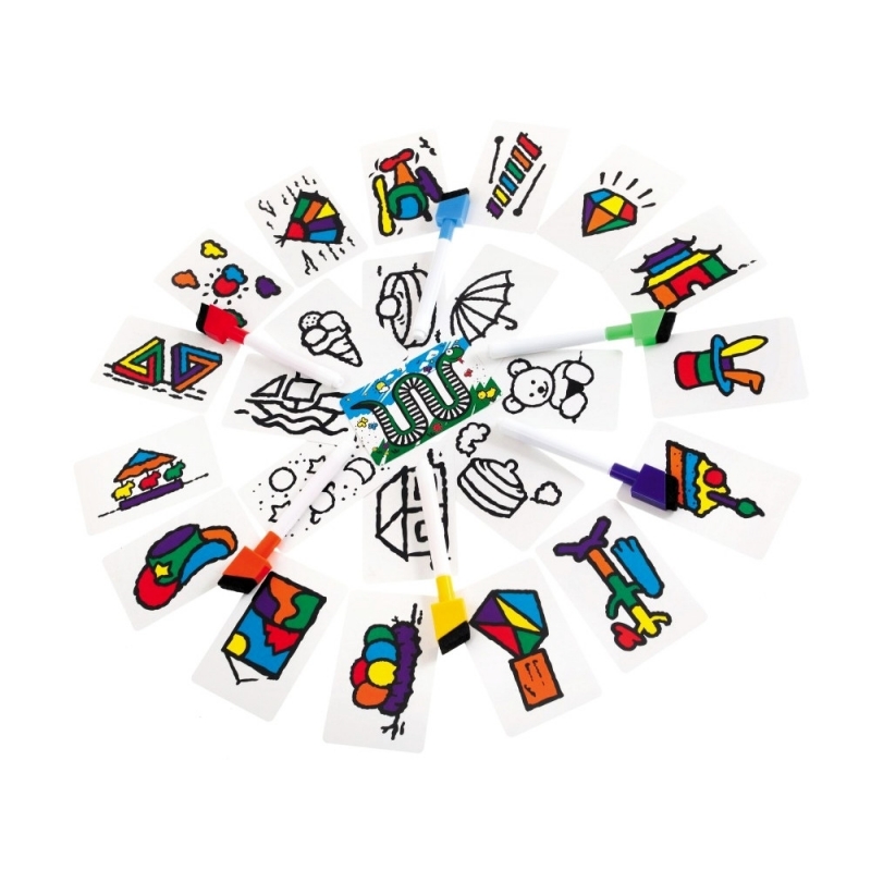 A játék tartalma: - 55 db színezhető kártya - 5 db pontozókártya - 6 db filc törlőszivaccsal - 1 db játékszabály Doboz mérete: 19x19x4 cm