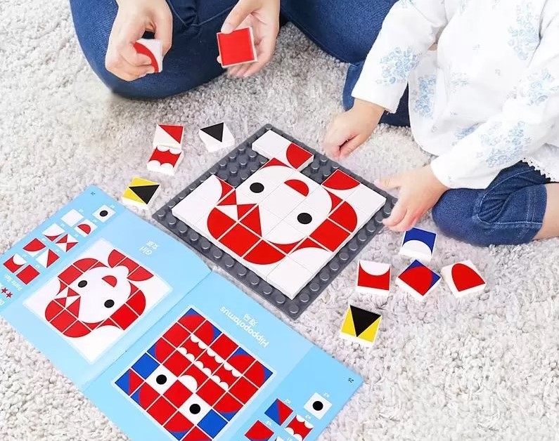 Arcok, állatfejek, járművek mind-mind megalkothatók, akár a feladatfüzet lapjainak alapján, akár a saját fantáziára támaszkodva. Az elemeken látható íves és szögletes formák megdolgoztatják a gyerekek agytekervényeit, hogy elképzeljék hogyan helyezzék el az egyes részeket, hogy az egész kép megvalósuljon.