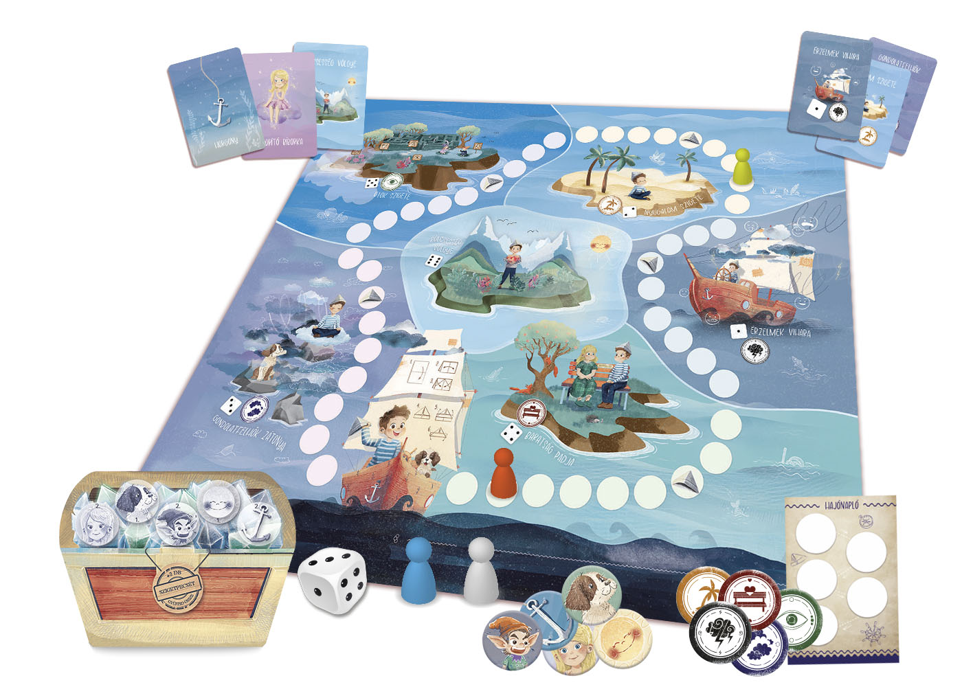 Pillanatkapitány küldetése – az érzelemszabályozás és a figyelemfejlesztés társasjátéka Korosztály: 3–12 éves korig Játékosok száma: 2–6 fő vagy csapat Játékidő: 30–60 perc Kialakítás: táblás fejlesztő társasjáték Tartalom: 1 db játéktábla, 1 db dobókocka, 6 db bábu, 6 db kincsesláda, 6 db hajónapló, 40 db játékmezőkorong, 30 db szigetpecsét, 75 db játékmezőkártya, 115 db szigetkártya, 1 db játékfüzet Felhasználás: óvoda, iskola, fejlesztő foglalkozás, SNI fejlesztés, csoportos és egyéni fejlesztés