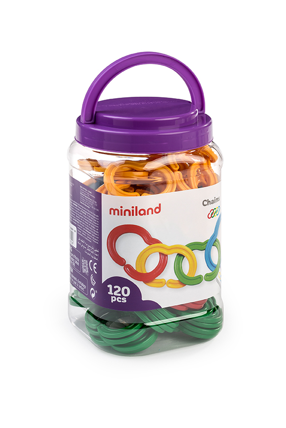 A MINILAND láncfűző készlete érdekes szórakozást nyújthat az óvodás korosztálynak. A láncszemek nagy méretének köszönhetően már egészen 2 éves kortól ügyeskedhetnek a gyermekek és szabadon fűzhetnek hosszabbnál-hosszabb láncokat.