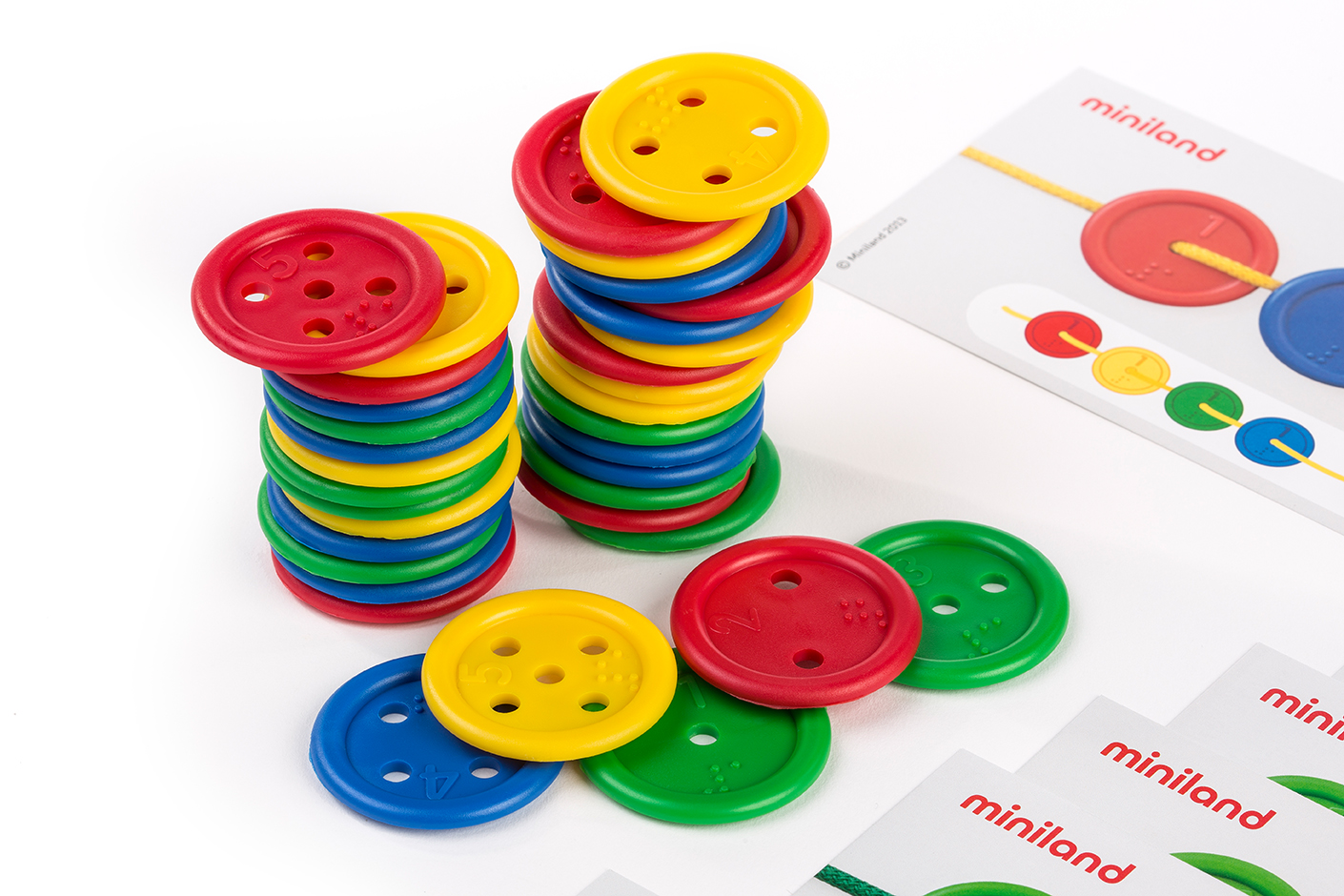 Tartalma: - 40 db főzhető gomb - 12 db feladatkártya - 5 db fűzőfonal A gombok különböző számú lyukkal vannak ellátva, 1-től 5-ig, összesen 4 különböző színben. Minden gomb tömör, minőségi műanyagból készült a tartósság érdekében. A szett egy füllel ellátott karton tárolódobozban érkezik, melyben később tárolhatjuk is az elemeket.