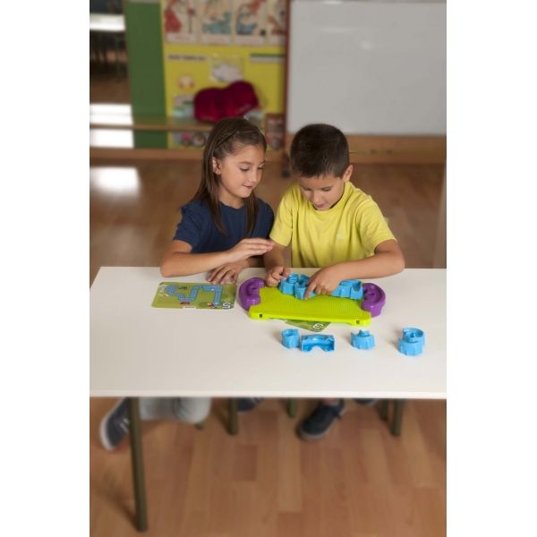 A feladatkártyák segítségével építsd meg a kanyargós labirintust, majd kézbe véve az alaptáblát vezesd a golyót a megfelelő helyre!