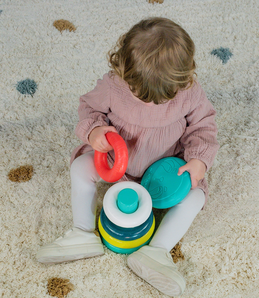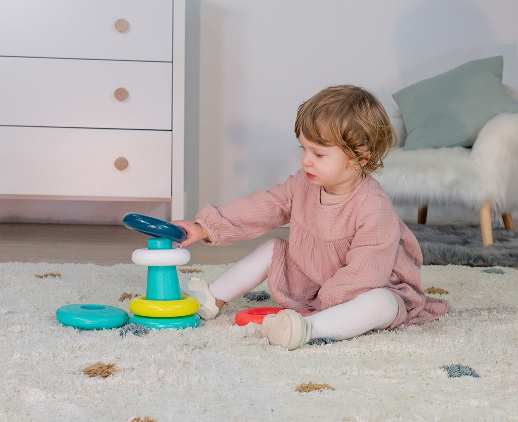 Tartalma: - 4 db karika - 1 db belső váz - 2 db lezáró sapka Mérete: 13x17,5 cm A különböző karikák más-más textúrával vannak ellátva, így csíkos és pöttyös felületű karika is megtalálható. A termék környezetbarát jelzéssel ellátott, hiszen környezetbarát alapanyagokból készül, ami csökkenti a természet káros terhelését. 6 hónapos korú gyermekek részére CE minősítéssel ellátva!