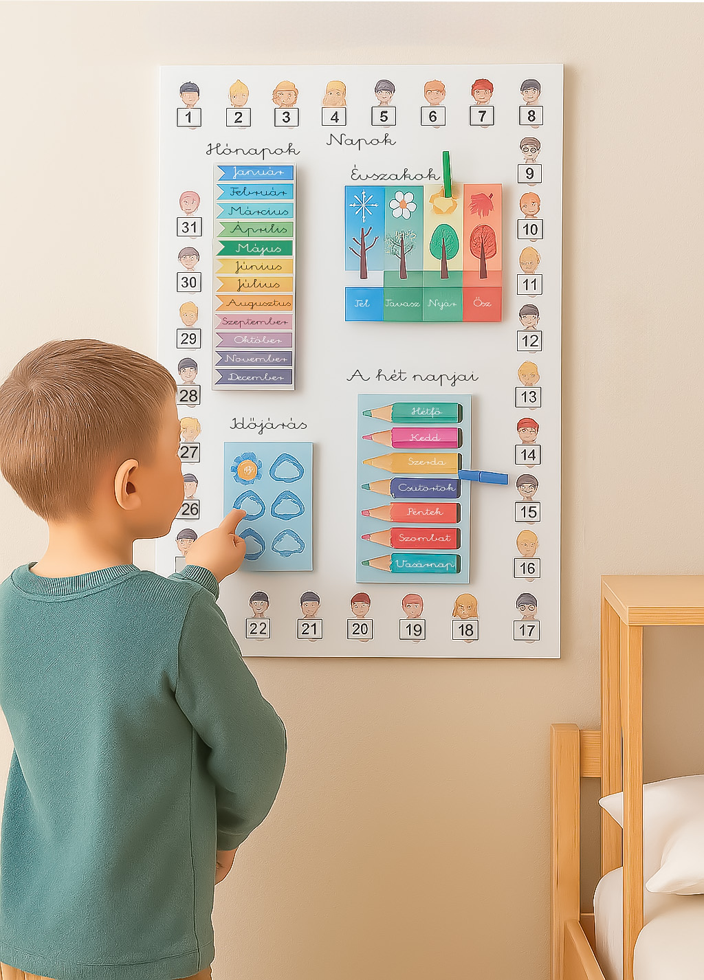 A naptár a hét napjait és az év hónapjait színes grafikákkal és gyermekbarát piktogramokkal mutatja be. A mozgatható csipeszek aktív részvételre ösztönzik a gyerekeket.