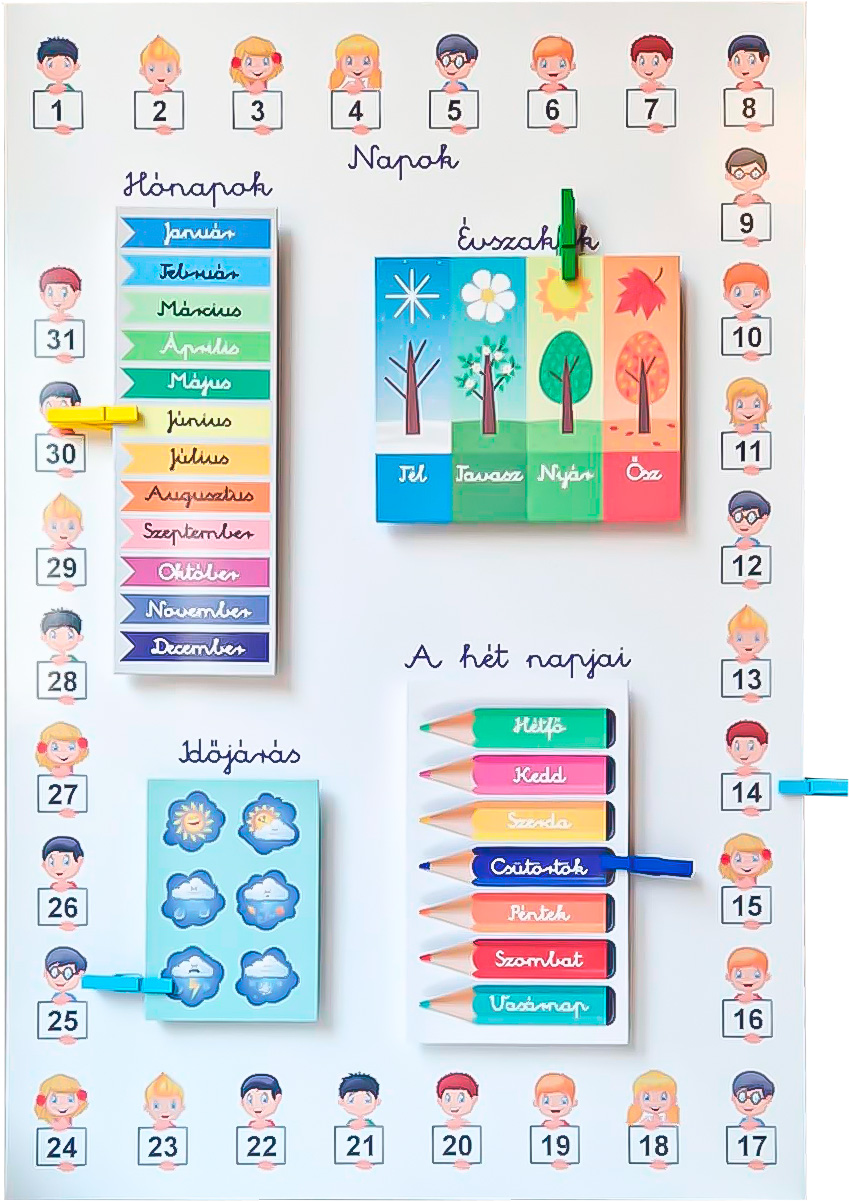 Ez a színes, vizuálisan átlátható naptár ideális segédeszköz az óvodai és alsó tagozatos napi rutin megalapozásához. A gyermekek segítségével könnyedén jelölhetők a hónapok, napok, évszakok, dátum és az aktuális időjárás – így fejlődik a téri–időbeli tájékozódásuk, a szókincsük, valamint az önálló napi strukturálás képessége is.