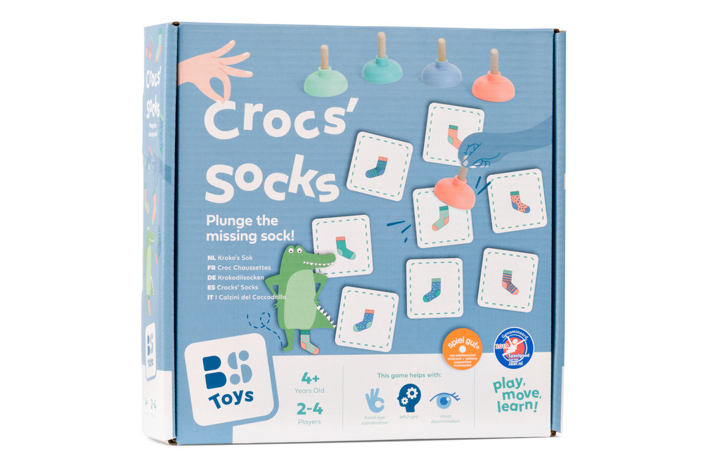 Segíts a krokodilnak megtalálni az elveszett zokniját! A BS Toys vidám társasjátéka egy izgalmas megfigyelős és gyorsasági játék, ahol a gyerekeknek a minták és színek alapján kell megtalálniuk a hiányzó zoknit – és minél gyorsabban lecsapniuk rá a kis tapadókorongos „pumpával”! Fejleszti a koncentrációt, a vizuális felismerést és a kéz-szem koordinációt, miközben rengeteg nevetést garantál.