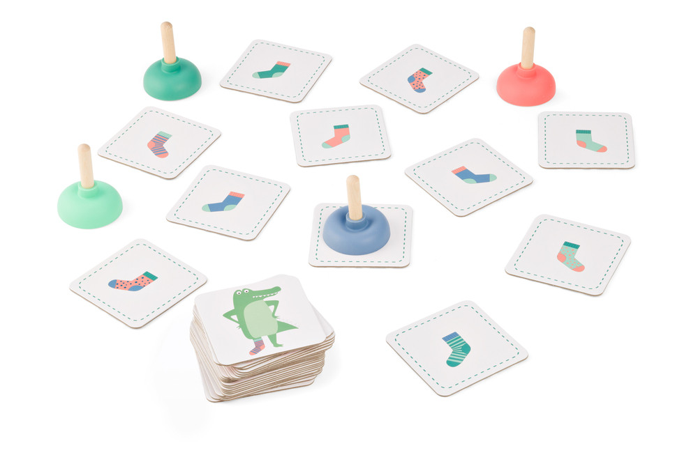 Fordítsd fel a kártyákat, és keresd meg, melyik zokni hiányzik a sorból! Aki először észreveszi, gyorsan „rácuppanthat” a tapadókorongos nyomóval. A legtöbb helyes találatot szerző játékos nyer. A játék több nehézségi szinten is játszható, így kisebbek és nagyobbak számára is élvezetes.