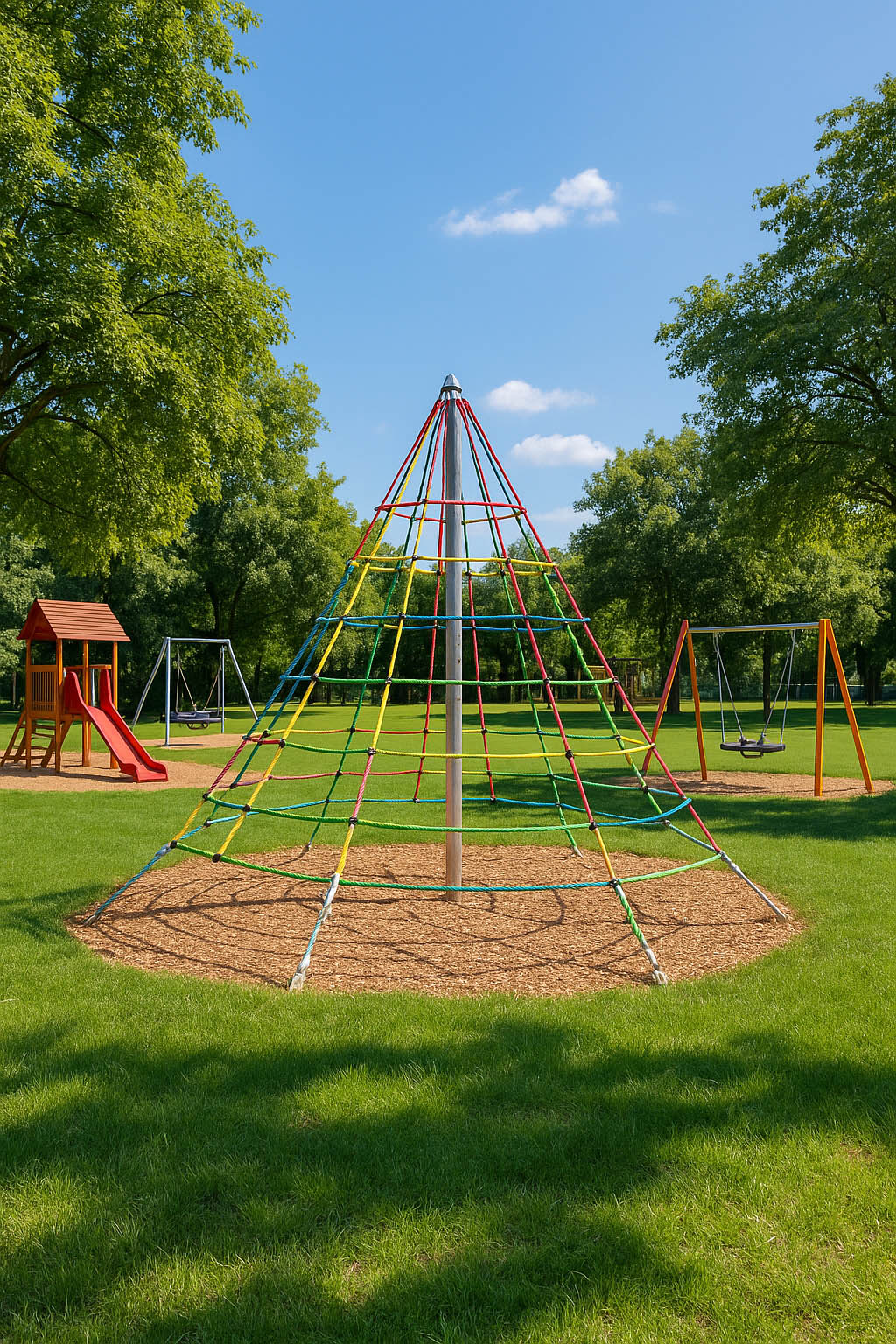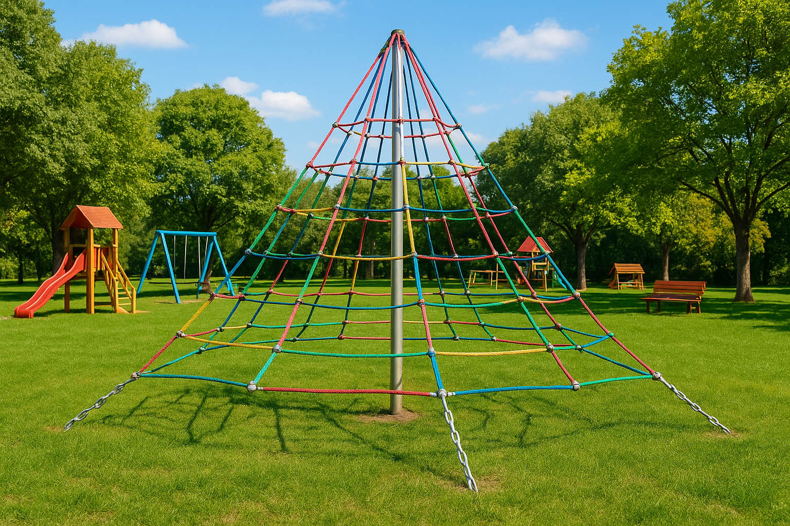 A mászó kötélpiramis izgalmas és kihívásokkal teli játszótéri elem, amely kiválóan fejleszti az egyensúlyt, erőnlétet és koordinációt a 3–8 éves gyerekek számára.
