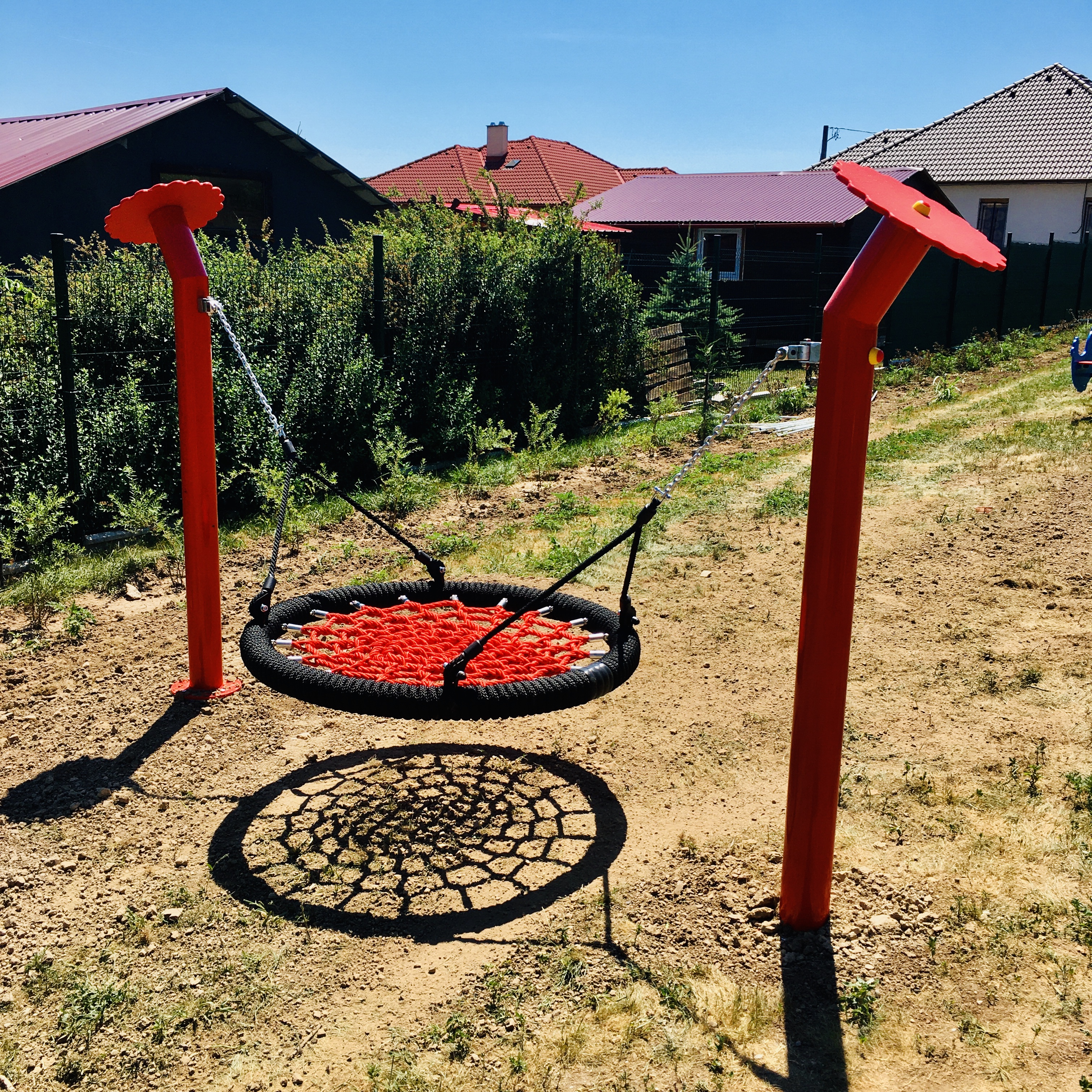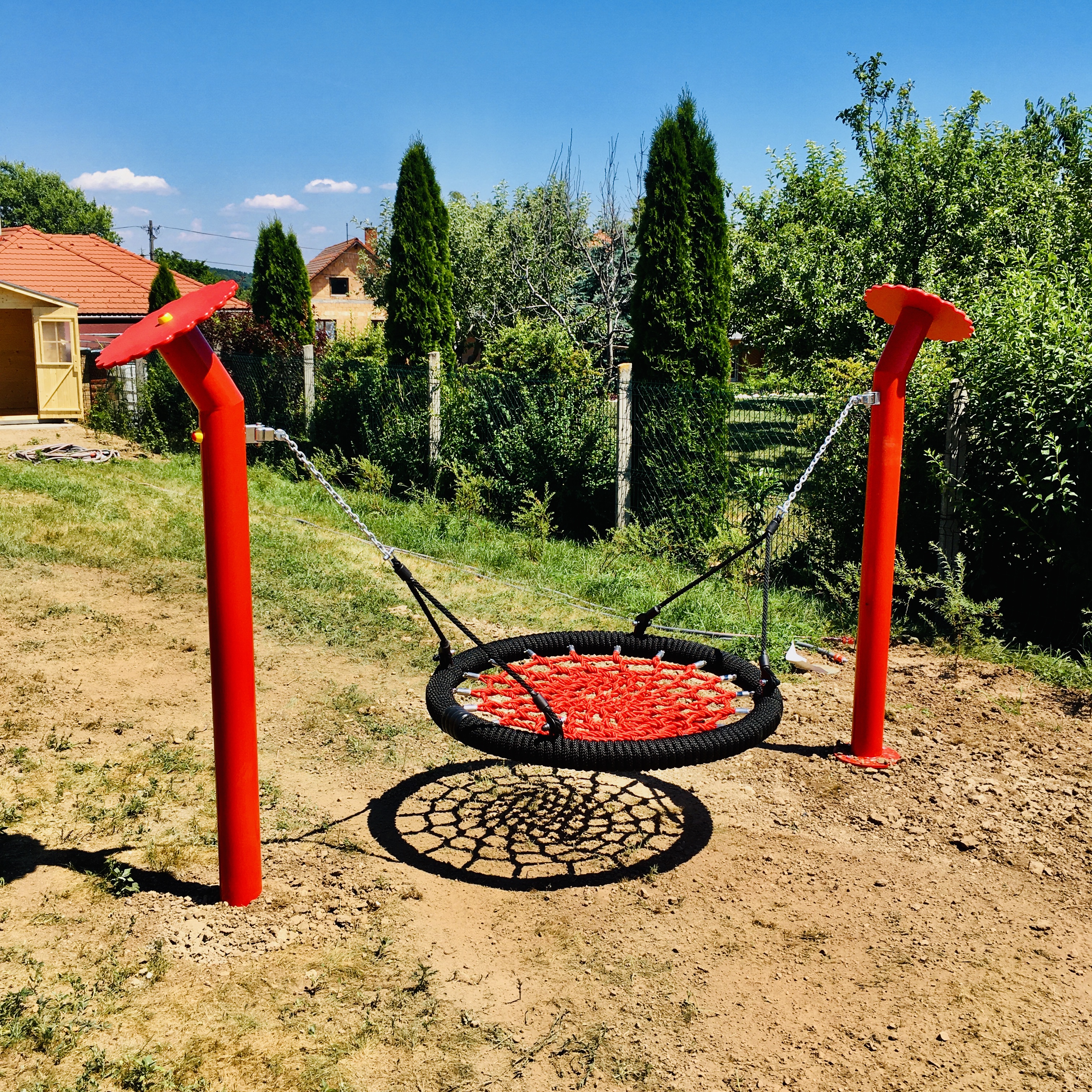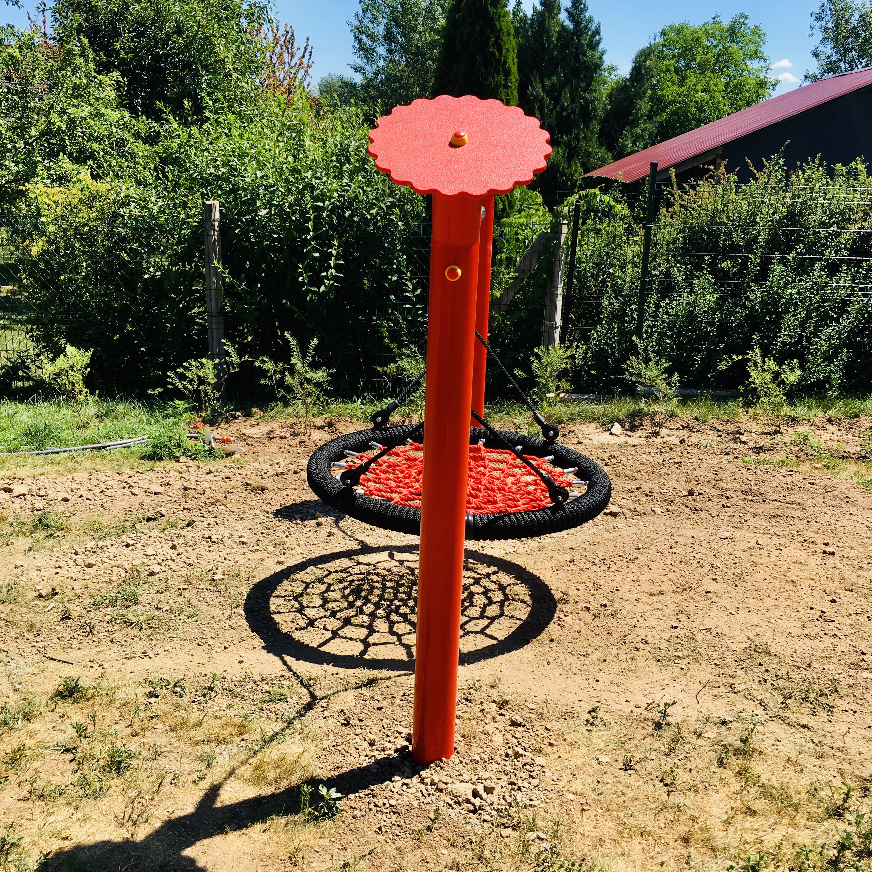 A masszív fém tartóoszlopok erős, időjárásálló szerkezetet biztosítanak, így hosszú távon is ideális választás közösségi játszóterekre, óvodákba vagy kertekbe.