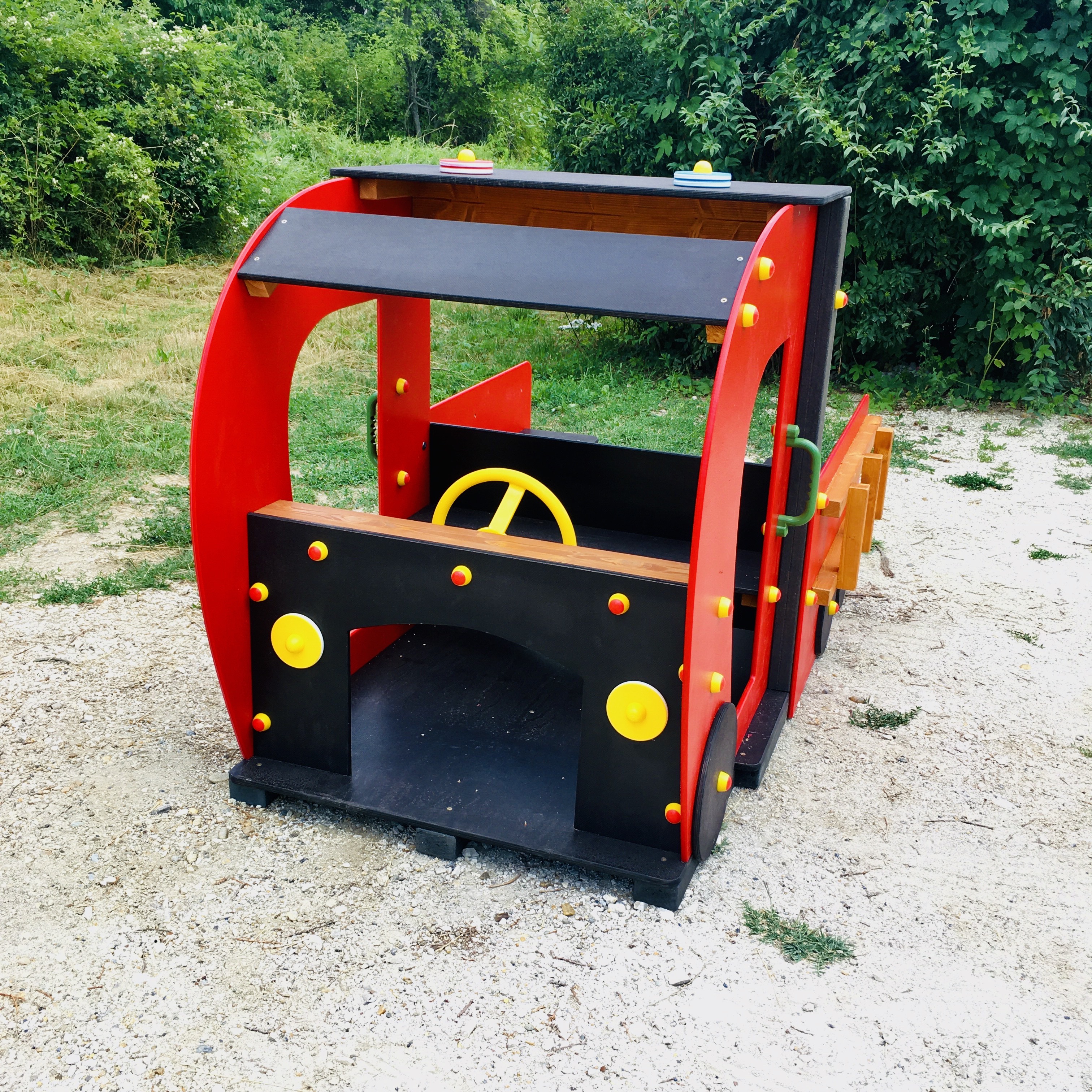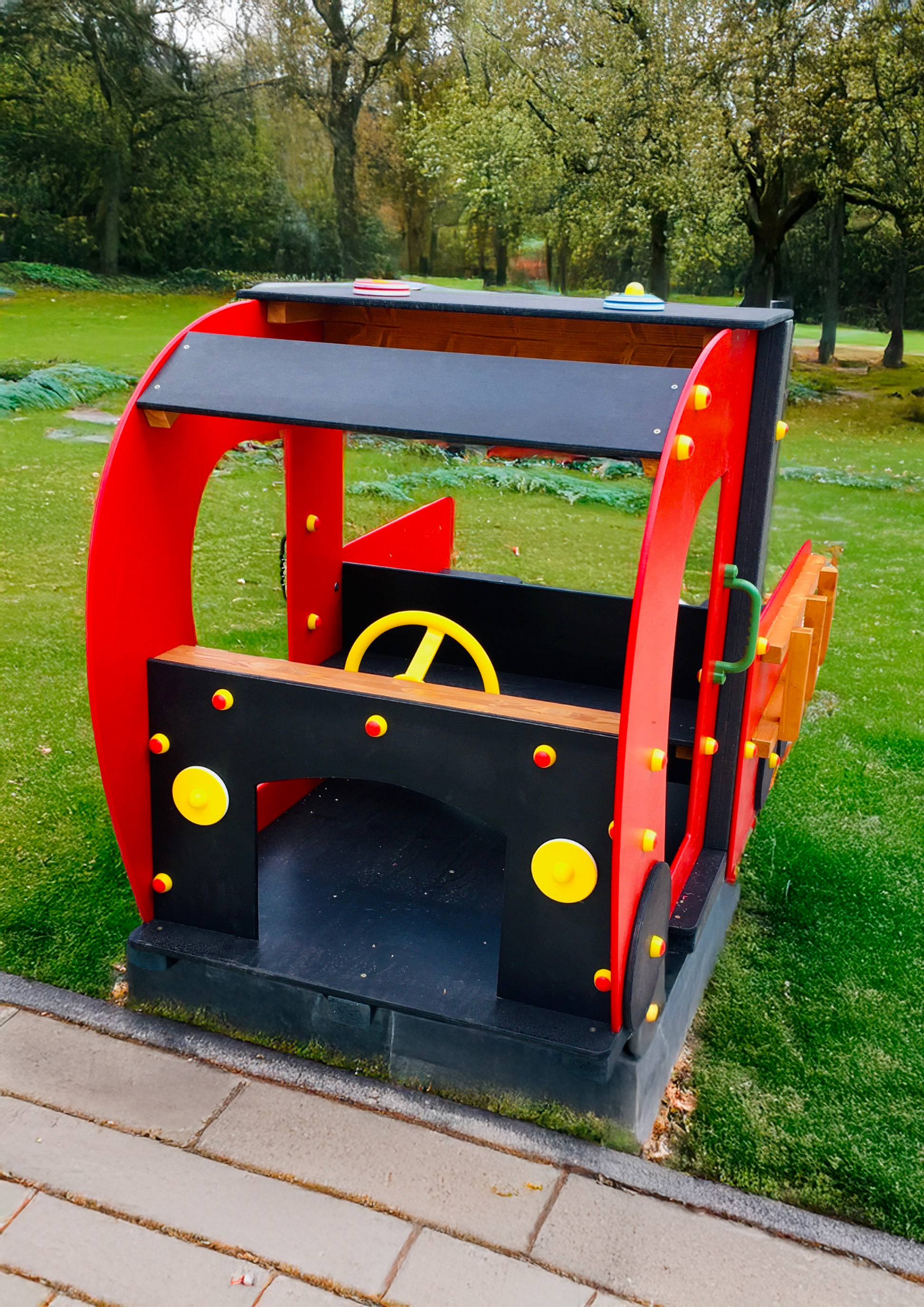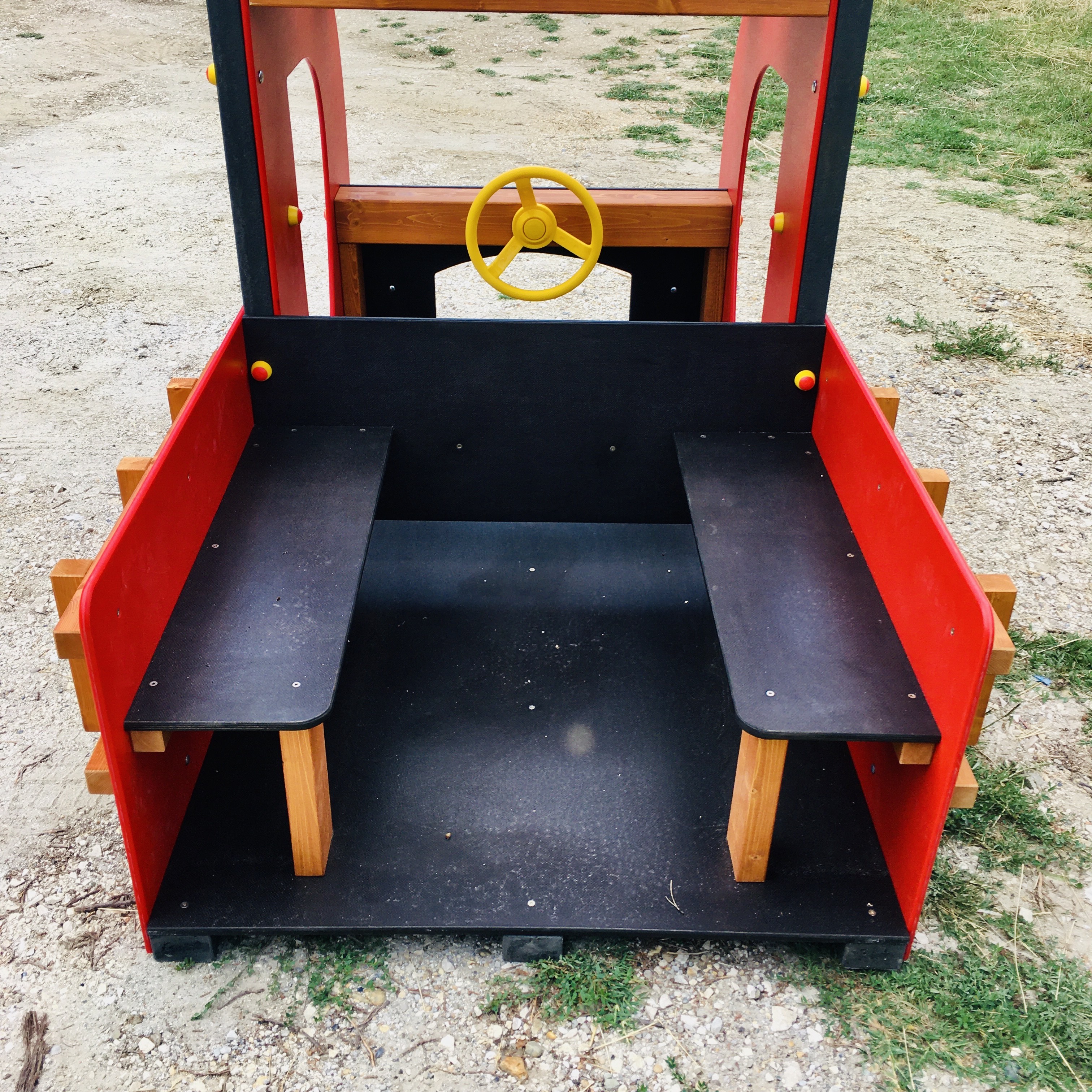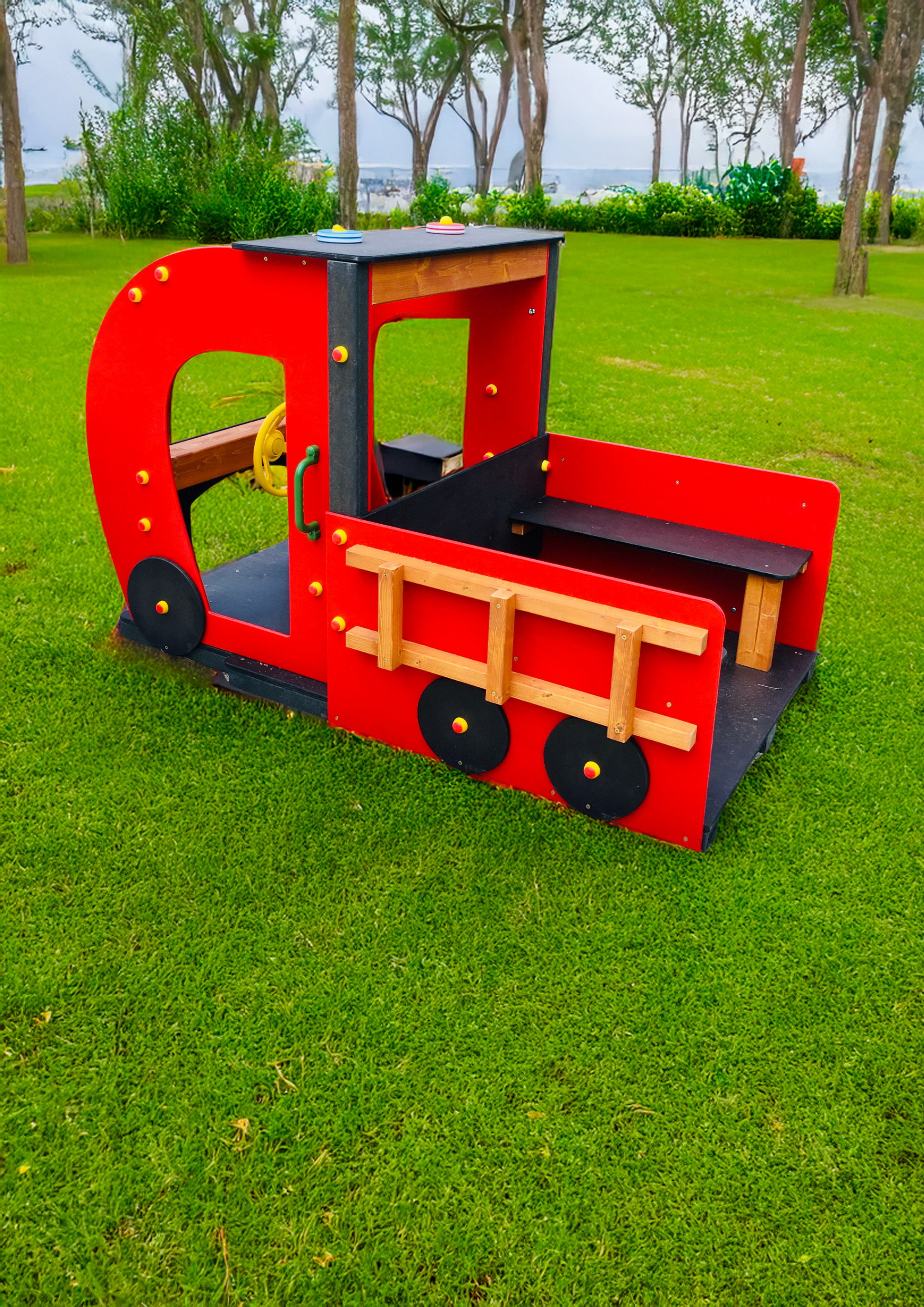 Színes, látványos szerepjáték-eszköz kisgyermekeknek, HDPE műanyag oldalfalakkal, csúszásmentes, időjárásálló padlózattal. A jármű elején sárga, forgatható kormánykerék található, hátul két beépített paddal, amely akár 4 gyermek számára is kényelmes elhelyezkedést biztosít. A dizájn része a tűzoltóautó jellegű színvilág (piros–fekete–sárga) és a natúr falécekből kialakított „létra” oldalsó díszítőelem. A kerekek fixek, esztétikus csavartakarókkal ellátva.