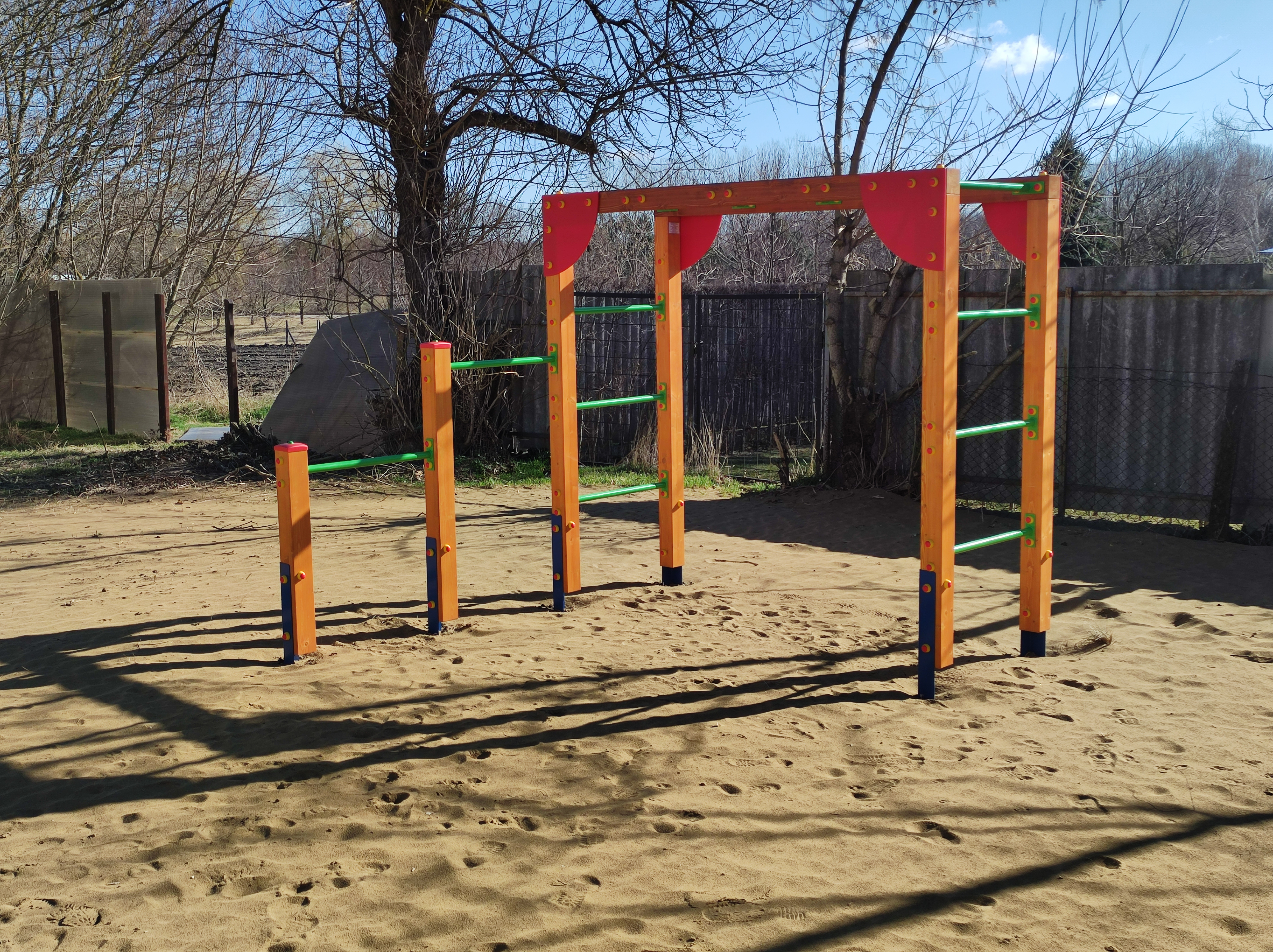 10x10 cm-es keresztmetszettel. Szinterezett fém kapaszkodókkal és tartólábakkal. A csavarokat esztétikus, színes csavartakarók fedik és teszik biztonságossá.