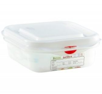Ételtárolására használható PP műanyagból készült edény GN 1/6 150-es méretben. Az edény légmentesen záródik az ételek további frissen tartása érdekében. Mikrohullámú sütőben és hűtőszekrényben egyaránt használható, -40C° +100C° között. Az edény a sarkoknál könnyen nyitható. Színkódos jelölésének köszönhetően könnyebb az átláthatóság a tárolás során. Helytakarékosan sorolhatóak.