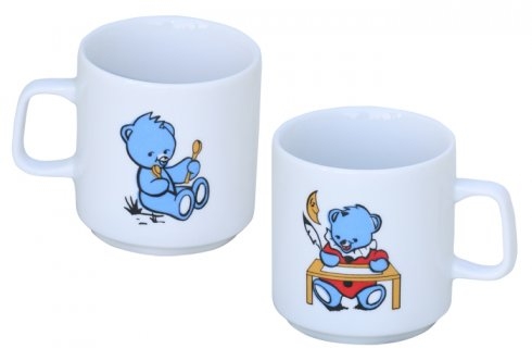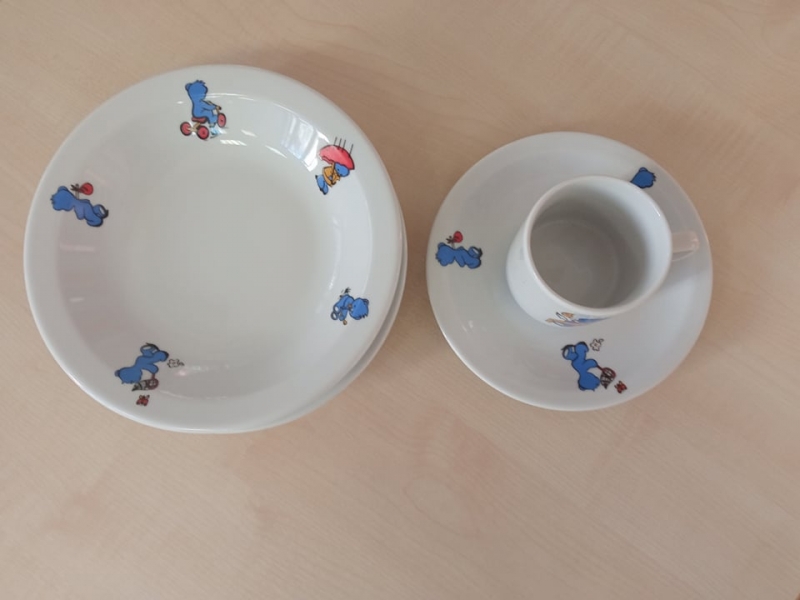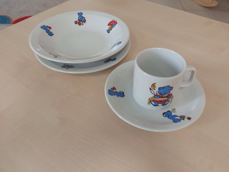 Kedvelt óvodai és bölcsődei Macimintás porcelán étkészlet. A 4 db-os szett tányérokat és bögrét tartalmaz.