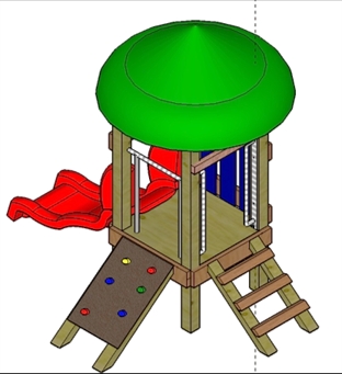 A kupolatető és a beülőkaros csúszda UV álló HDPE műanyag. A deszkázat, padlózat anyaga nagynyomáson telített, festett fenyő. Az oszlopok anyaga, telített fenyő, újrahasznosított műanyag. A létra oszlop, mászófal oszlop anyaga újrahasznosított műanyag. A mászófal csúszásmentes rétegelt lemezből, a mászófal elemek HDPE műanyagból készülnek. A kapaszkodók fémből készülnek, horganyzott, ill. színterezett kivitelben. Az oszlopok újrahasznosított műanyagból készülnek. A csavartakarók és a mászófal kapaszkodók műanyagból készültek.