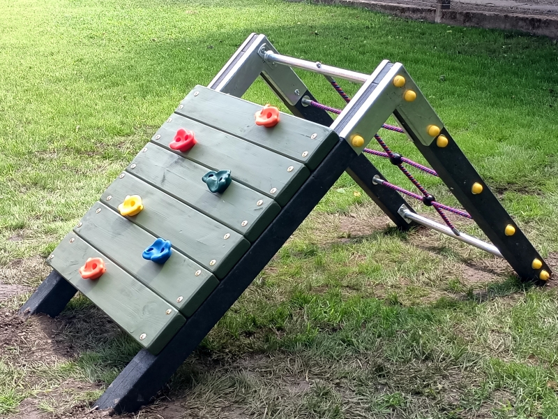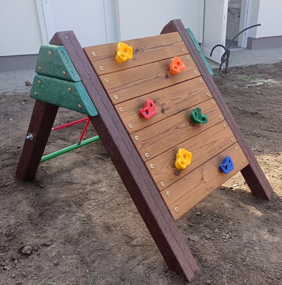 Ez a strapabíró, háromszög alakú mászóka ideális választás óvodai és játszóudvari használatra. A biztonságos, masszív fa szerkezetet színes műanyag kapaszkodók egészítik ki, amelyek segítségével a gyermekek könnyedén és élvezetesen gyakorolhatják a mászást.A játék nemcsak szórakozást nyújt, hanem hozzájárul a mozgáskoordináció, az ügyesség és az erőnlét fejlesztéséhez is. A mászóka stabil kialakítású, telepítést igényel a biztonságos használat érdekében.Főbb jellemzők:Háromszög alakú, stabil fa szerkezetSzínes kapaszkodó kövek és mászóhálós kialakítás a könnyebb mászáshozKisgyermekek számára tervezve, játszóudvarra ideálisFejleszti az ügyességet, egyensúlyt és mozgáskoordinációtTelepítést igényel a biztonságos rögzítés érdekében.