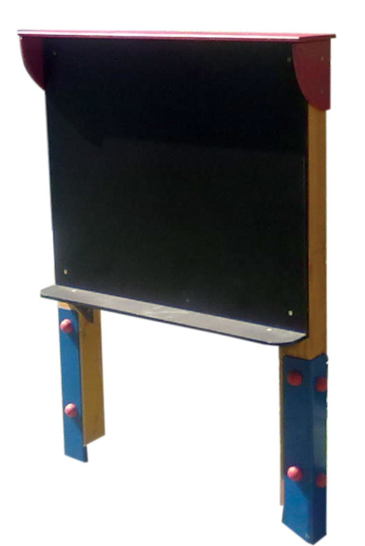 Műanyag újrahasznosított lábak, műanyag színes díszítő elemek.Részben gondozásmentes kivitel. A tábla rétegelt vízálló fa lemez amely speciális kültéri táblafestékkel van lefestve.. Teljes magasság: 130 cm. Szélesség 90 cm. Az írófelület mérete 65x90 cm. Telepítést igényel. , anyaga: Gondozásmentes fa, újrahasznosított műanyag elemek, rétegelt lemez, fém saruk.