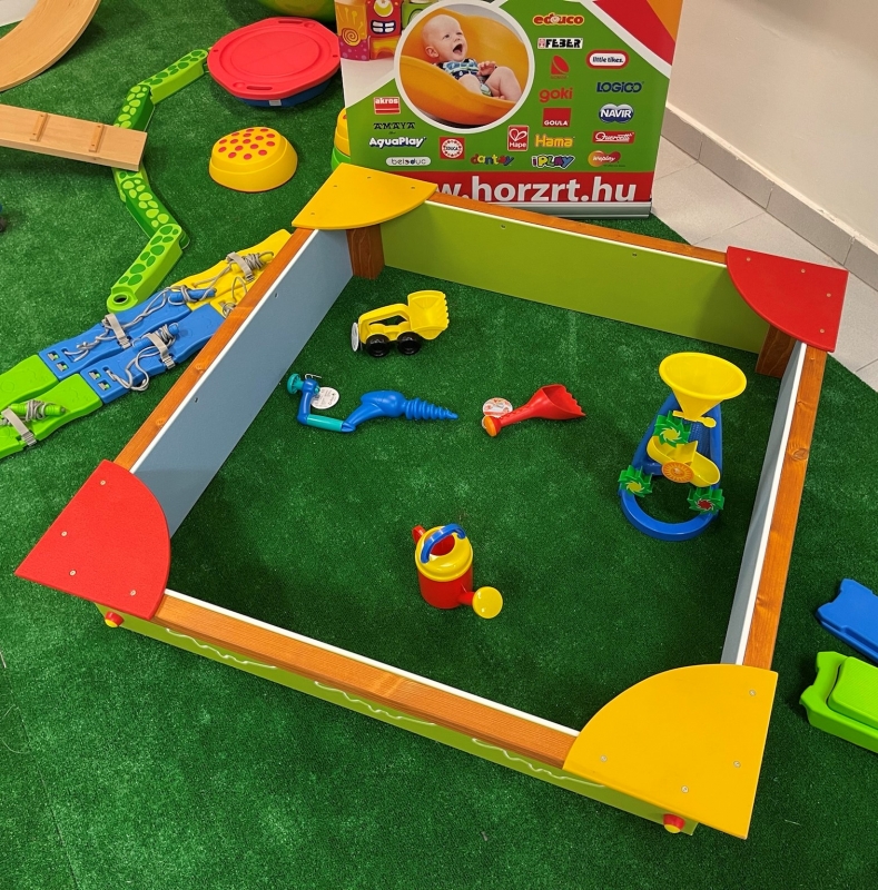 Homokozókeret mérete: 400x400 cm - süllyeszthető - újrahasznosított műanyagból, színes, dekorált oldalakkal, anyaga: újrahasznosított műanyagból, színes, dekorált oldalakkal Ajánlott korosztály 0-14 éves korosztály részére.