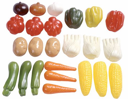 Termék mérete: 5-9 cm Tartalma: 24 darab játék élelmiszer 3 db paradicsom, 3 db paprika (piros, zöld, sárga), 3 db burgonya, 3 db répa, 3 db cukkini, 3 db kukorica, 3 db édeskömény, 3 db hagyma (vörös, fehér, lila)