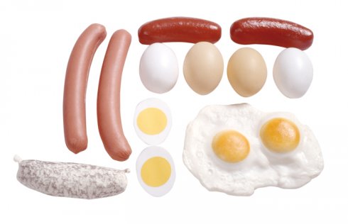 Tartalma: 12 db 6-16 cm-es játék élelmiszer: 2 db sült kolbász, 2 db virsli, 1 db dupla tükörtojás, 2 db nyers tojás, 2 db főtt tojás, 2 db fél főtt tojás