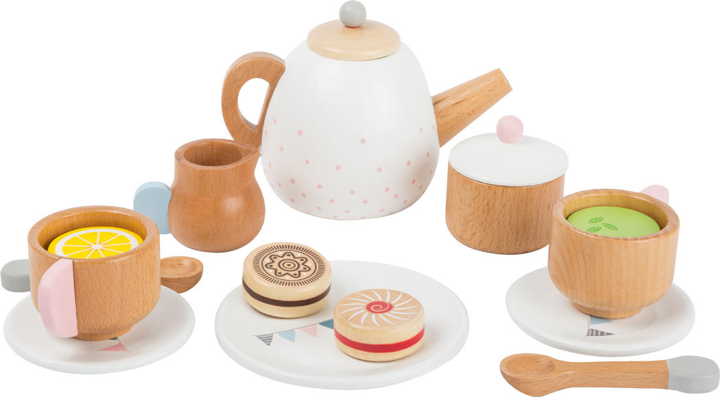 Tartalma: - 1 db teáskanna - 1 db cukros tál - 1 db tejes kancsó - 2 db teasütemény - 1 db citromtea korong - 1 db borsmenta tea korong - 1 db vaníliás epertea korong - 1 db nagy tányér - 2 db kistányér - 2 db kiskanál - 2 db teás csésze Méretek: - Kancsó: 13x8x9 cm - Csésze: 7x5x4 cm Az összes elem minőségi fából készült, kellemes kék, rózsaszín, fehér, szürke, és natúr árnyalatokban. A készlet igazán modern megjelenésével a babakonyhák dísze lehet.
