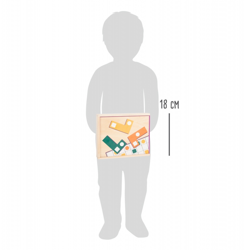 Tartalom: Fa tároló doboz, 15 db két oldalas feladat kártya, 12 db fából készült különböző színű és formájú elem. Termék mérete: Doboz: kb. 23x18x4 cm fa elemek: kb. 7,5x5x1 cm