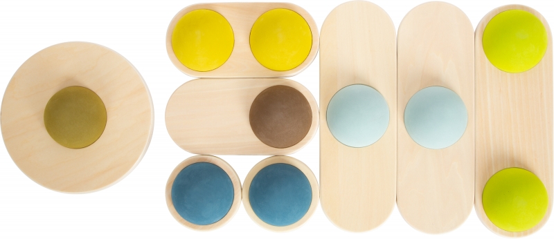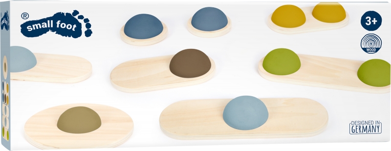 Az egyensúlyozó kövek alapja natúr fa, kiemelkedő félgömb alakú része habszivacs. A készletben több méretben találhatók meg az alaplapok. Nagy kiegyensúlyozó kő magasság: 4 cm, átmérője: 20 cm Kis kiegyensúlyozó kő magassága: 4 cm, átmérője: 9,5 cm Max. teherbírása: 50 kg