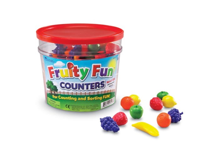 A Learning Resources 108 darabos műanyag gyümölcskészletének elemei puha gumiból készültek, színük élénk és az adott gyümölcsre jellemző. A csomagban megtalálható a szeder, az eper, a zöldalma, a narancs, a citrom és a banán. Kialakításuk aprólékos, felületük textúrált. A gyümölcsök mérete: 2-5 cm. A készlet egy praktikus műanyag tárolóban érkezik. A csomagolás mérete: 15x15x13 cm