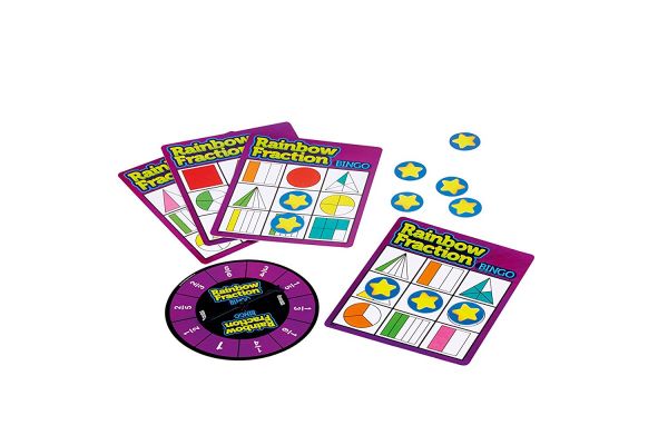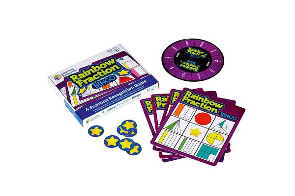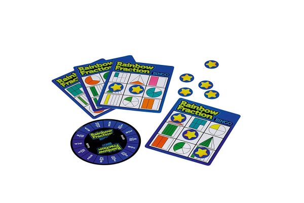 A Learning Resources törtes bingó társasjátékában 4 db dupla oldalú bingó játékkártya, 36 db csillag jelölő és 1 db dupla oldalú pörgettyű található. Az ismert bingó játéknak megfelelően a feladatkártyák 9 egyenlő részre vannak osztva, mindegyik részben 1-1 geometriai forma található, amik további egyenlő részekre vannak felosztva. A pörgettyűn a törtek számképes alakjai láthatóak, fehérrel írva. A táblák lila és kék színben elérhetőek, egyszerre 2-4 játékos játszhat a játékkal. A termék elemei vastag kartonból készültek. A táblák és a pörgettyű is nehézségi szintek alapján vannak besorolva. A csomagolás mérete: 22x17x3 cm