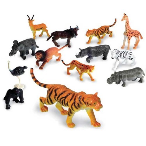 A készletben a következő 12 féle állat található: zsiráf, elefánt, oroszlán, víziló, orrszarvú, tigris, gepárd, strucc, gorilla, antilop, gnú, zebra.