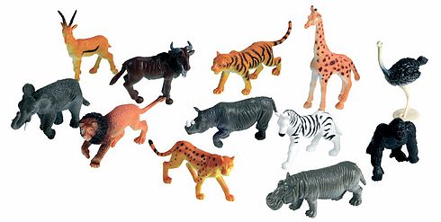A készletben a következő 12 féle állat található: zsiráf, elefánt, oroszlán, víziló, orrszarvú, tigris, gepárd, strucc, gorilla, antilop, gnú, zebra, fajtánkét 5-5 darab.